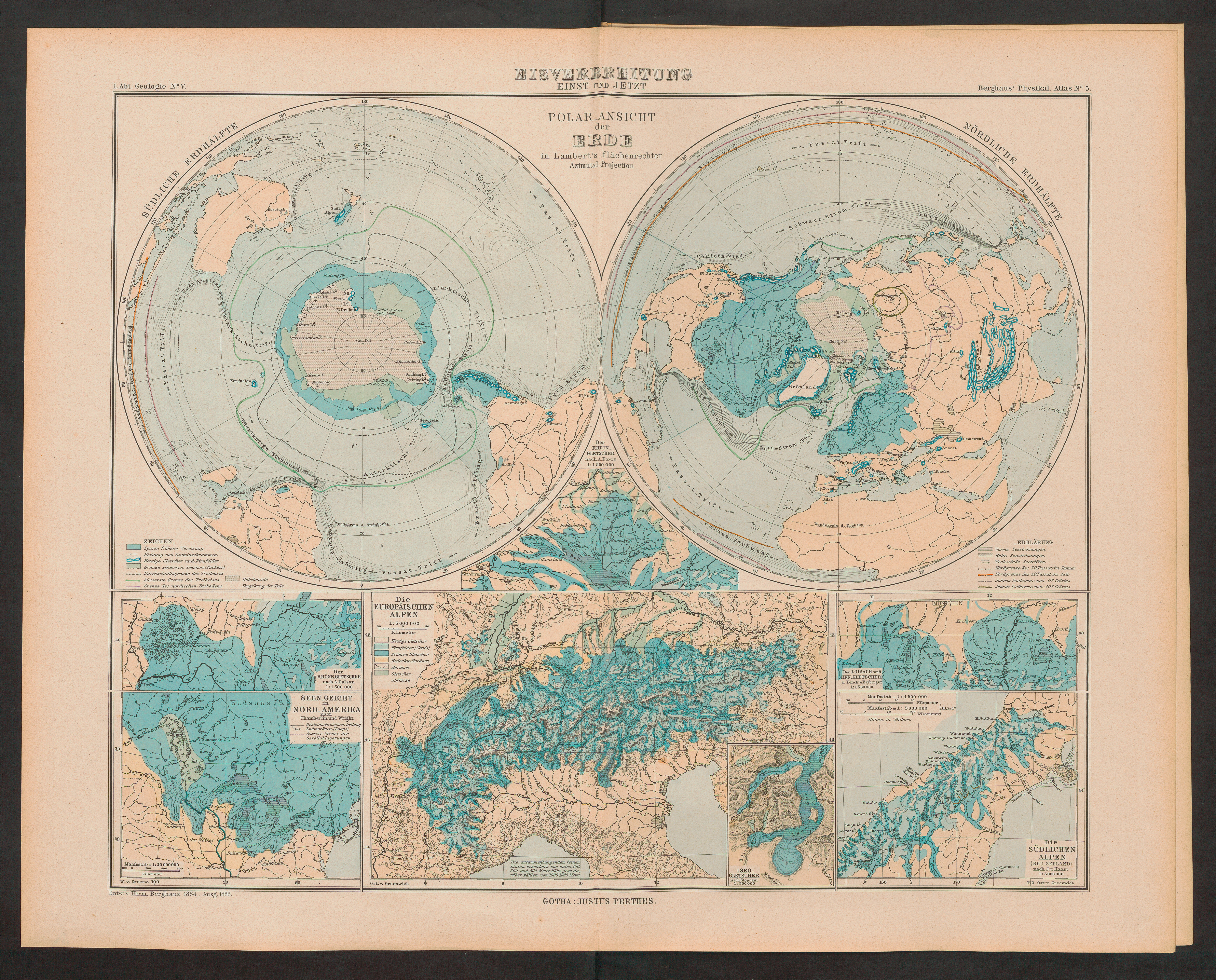 Atlas der Geologie : 15 kolorierte Karten in Kupferstich mit 150 Darstellungen / unter beratender Mitwirkung von Prof. Dr. K. v. Zittel bearbeitet von Dr. Hermann Berghaus, Professor in Gotha