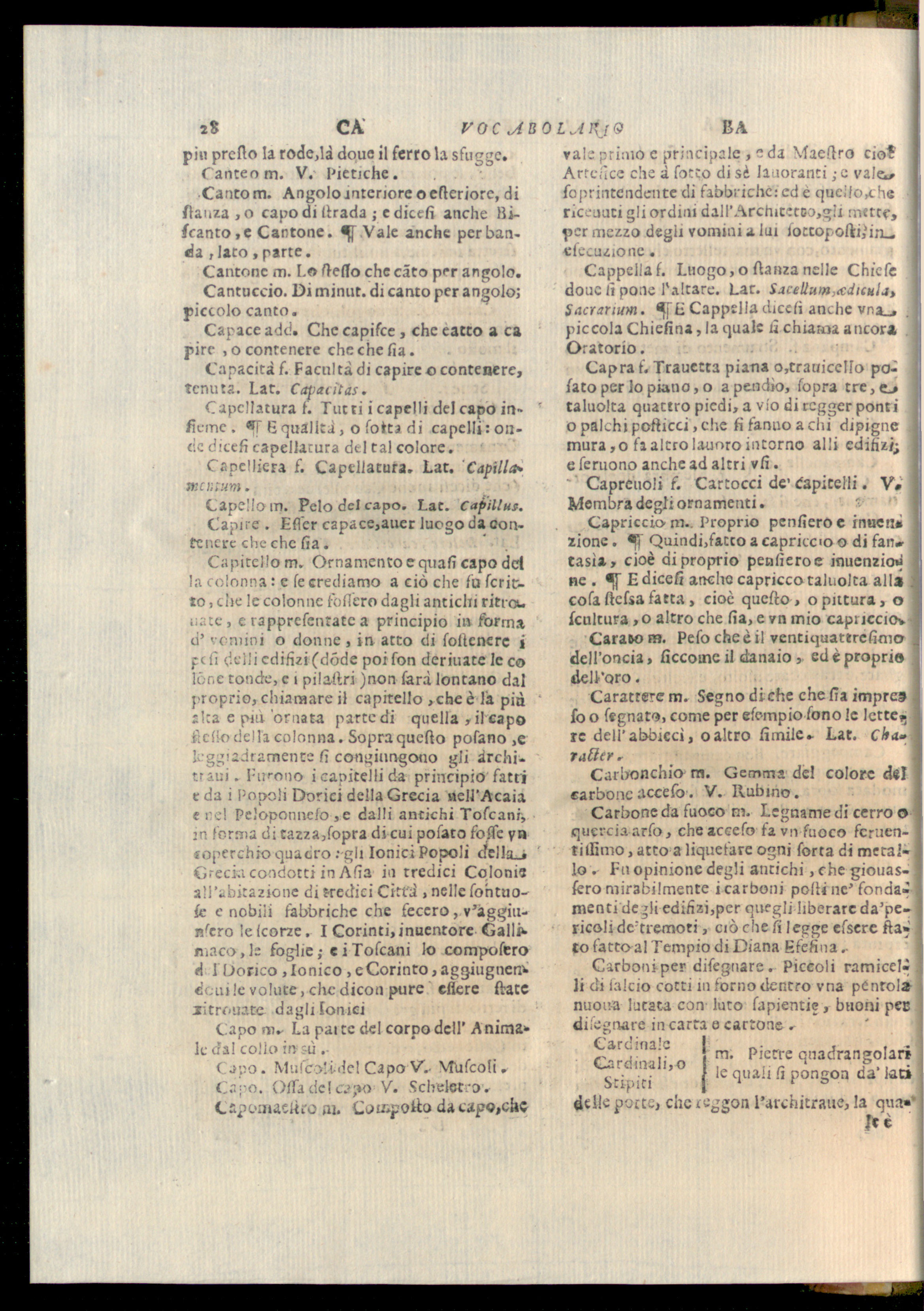 Vocabolario toscano dell'arte del disegno : nel quale si esplicano i propri termini e voci, non solo della pittura, sculptura et architettura ma ancora di altri arti ... : con la notizia De'nomi o qualità delle gioie, metalli, pietre dure, marmi, pietre tenere, saffi, legnami ... / opera di Filippo Baldinucci Fiorentino
