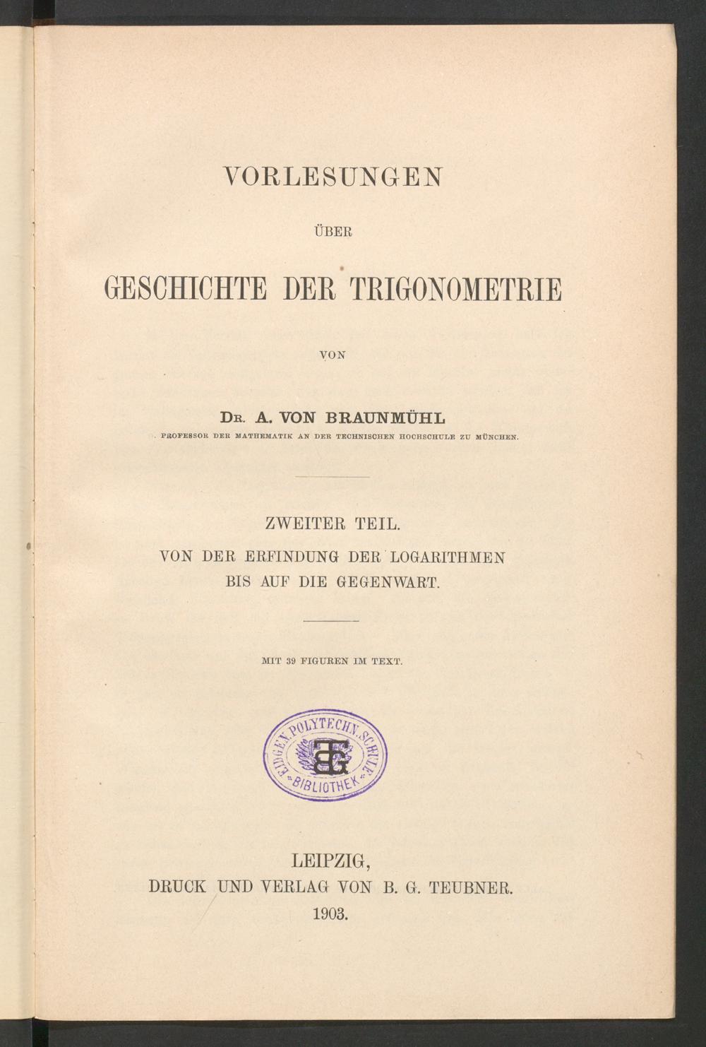 Zweiter Teil. Von der Erfindung der Logarithmen bis auf die Gegenwart / von Dr. A. von Braunmühl