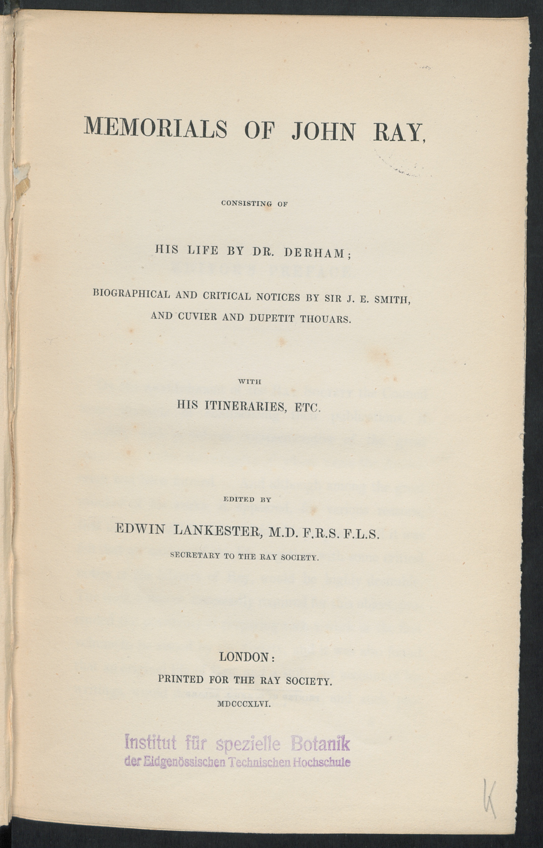 Memorials of John Ray : with his itineraries, etc / consisting of his life by Dr. Derham, biographical and critical notices by Sir J.E. Smith, and Cuvier and Dupetit Thouars. Ed. by Edwin Lankester