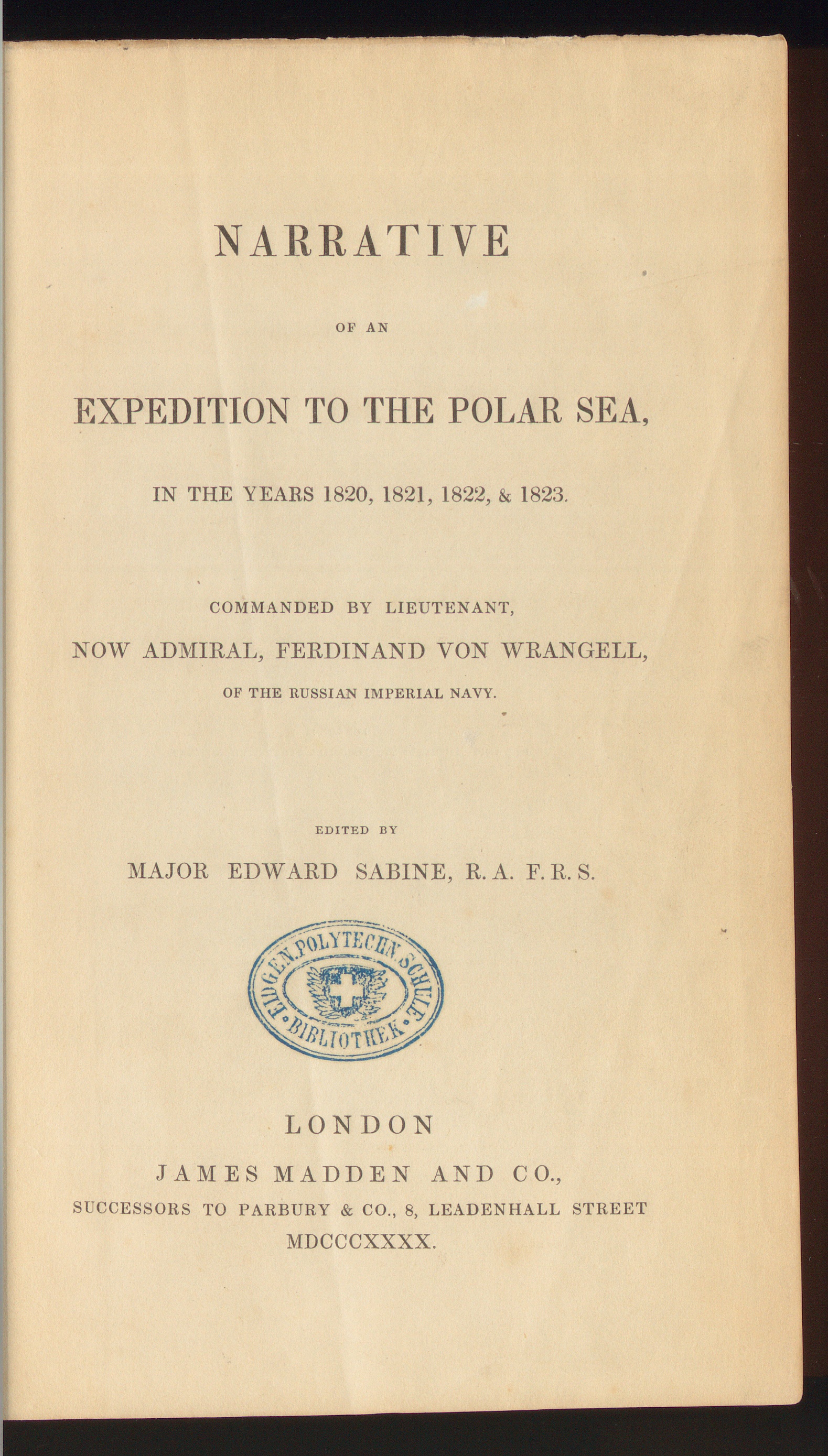 Narrative of an expedition to the Polar Sea, in the years 1820, 1821, 1822, & 1823, commanded by Lieutenant, now Admiral, Ferdinand von Wrangell / edited by Major Edward Sabine