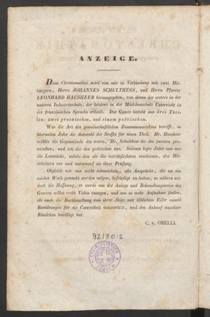 Zweiter prosaischer Theil, enthaltend eine Auswahl von historischen Darstellungen, Biographien, Naturschilderungen, Reisebeschreibungen nebst einem historischen Drama mit Anmerkungen und häufiger Hinweisung auf die Sprachlehre von Hirzel für mittlere Classen / herausgegeben von Conrad v. Orelli