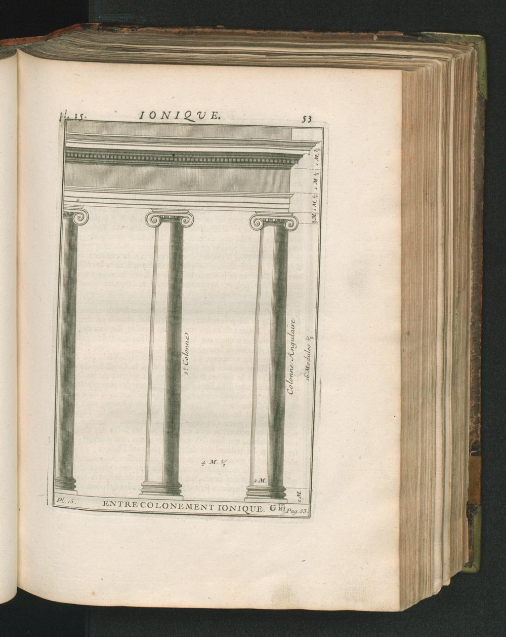 Cours d'architecture : qui comprend les Ordres de [Jacques Barozzio, dit Le] Vignole, avec des commentaires, les figures & les descriptions de ses plus beaux bâtimens, & de ceux de Michel-Ange, des instructions et des préceptes & plusieurs nouveaux desseins concernans la distribution & la décoration, la matière & la construction des édifices, la maçonnerie, la charpenterie, la couverture, la serrurerie, la menuiserie, le jardinage, & généralement tout ce qui regarde l'art de bastir / par C. A. [i.e. Augustin-Charles] d'Aviler