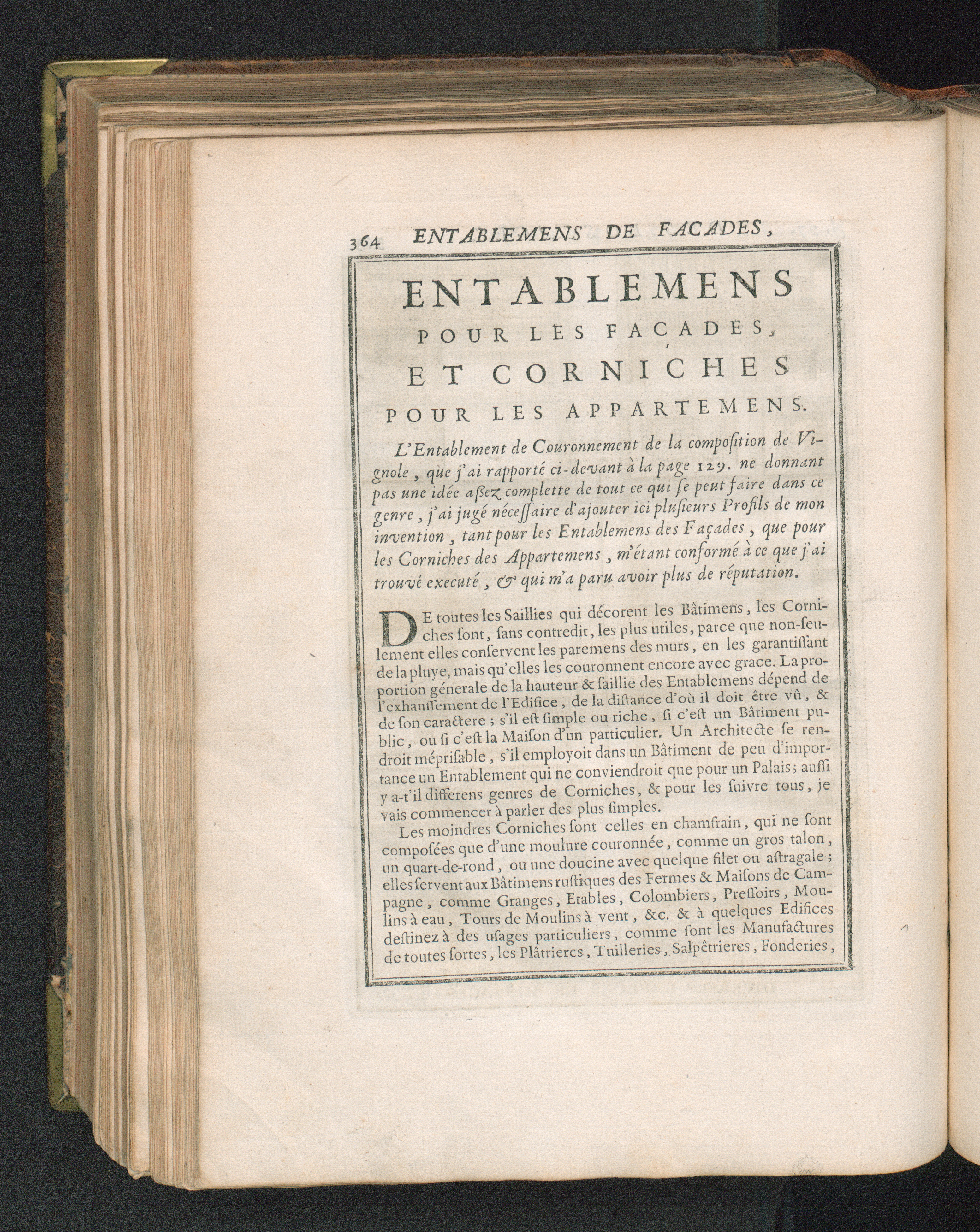 Cours d'architecture : qui comprend les Ordres de [Jacques Barozzio, dit Le] Vignole, avec des commentaires, les figures & les descriptions de ses plus beaux bâtimens, & de ceux de Michel-Ange, des instructions et des préceptes & plusieurs nouveaux desseins concernans la distribution & la décoration, la matière & la construction des édifices, la maçonnerie, la charpenterie, la couverture, la serrurerie, la menuiserie, le jardinage, & généralement tout ce qui regarde l'art de bastir / par C. A. [i.e. Augustin-Charles] d'Aviler