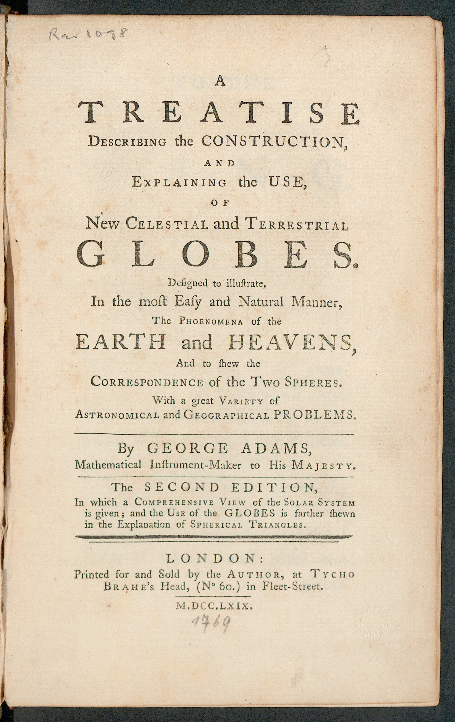 A treatise describing the construction, and explaining the use of new celestial and terrestrial globes : designed to illustrate in the most easy and natural manner, the phaenomena of the earth and heavens, ant to shew the correspondence of the two spheres : with great variety of astronomical and geographical problems / by George Adams, mathematical instrument-maker ...
