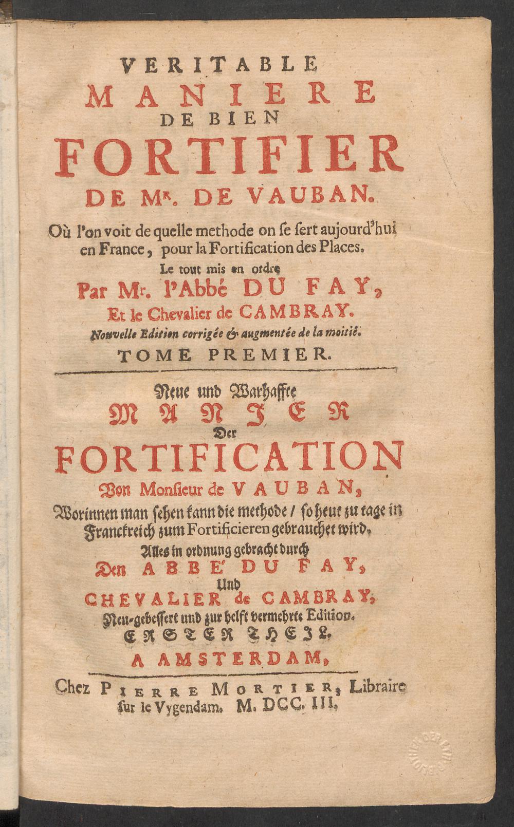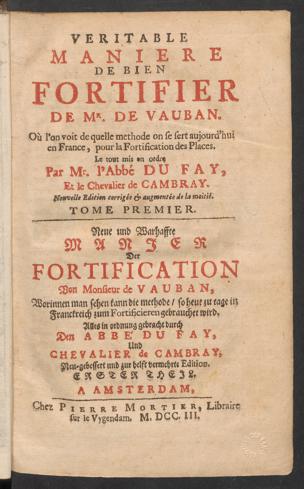 Véritable manière de bien fortifier de Mr. de Vauban : où l'on voit de quelle methode on se sert aujourd'hui en France, pour la fortification des places = Neue und warhaffte manier der fortification von ... de Vauban, worinnen man sehen kann die Methode, so heut zu tage in Franckreich zum Fortificieren gebrauchet wird ... / le tout mis en ordre par ... du Fay, et ... de Cambray