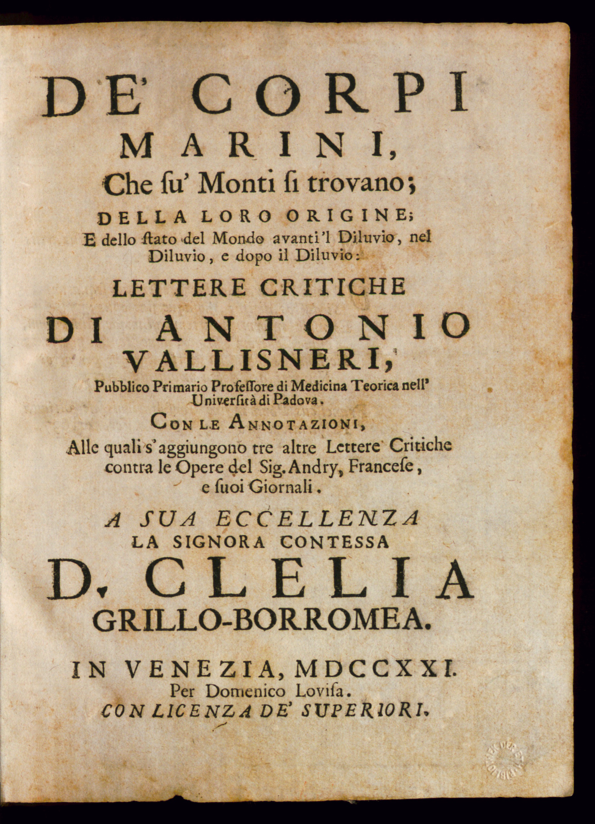 De' corpi marini, che su' monti si trovano; della loro origine; e dello stato del mondo avanti 'l diluvio, nel diluvio, e dopo il diluvio / lettere critiche di Antonio Vallisneri; con le annotazioni, alle quali s'aggiungono tre altre lettre critiche contra le opere del sig. Andry, francese, e suoi giornali