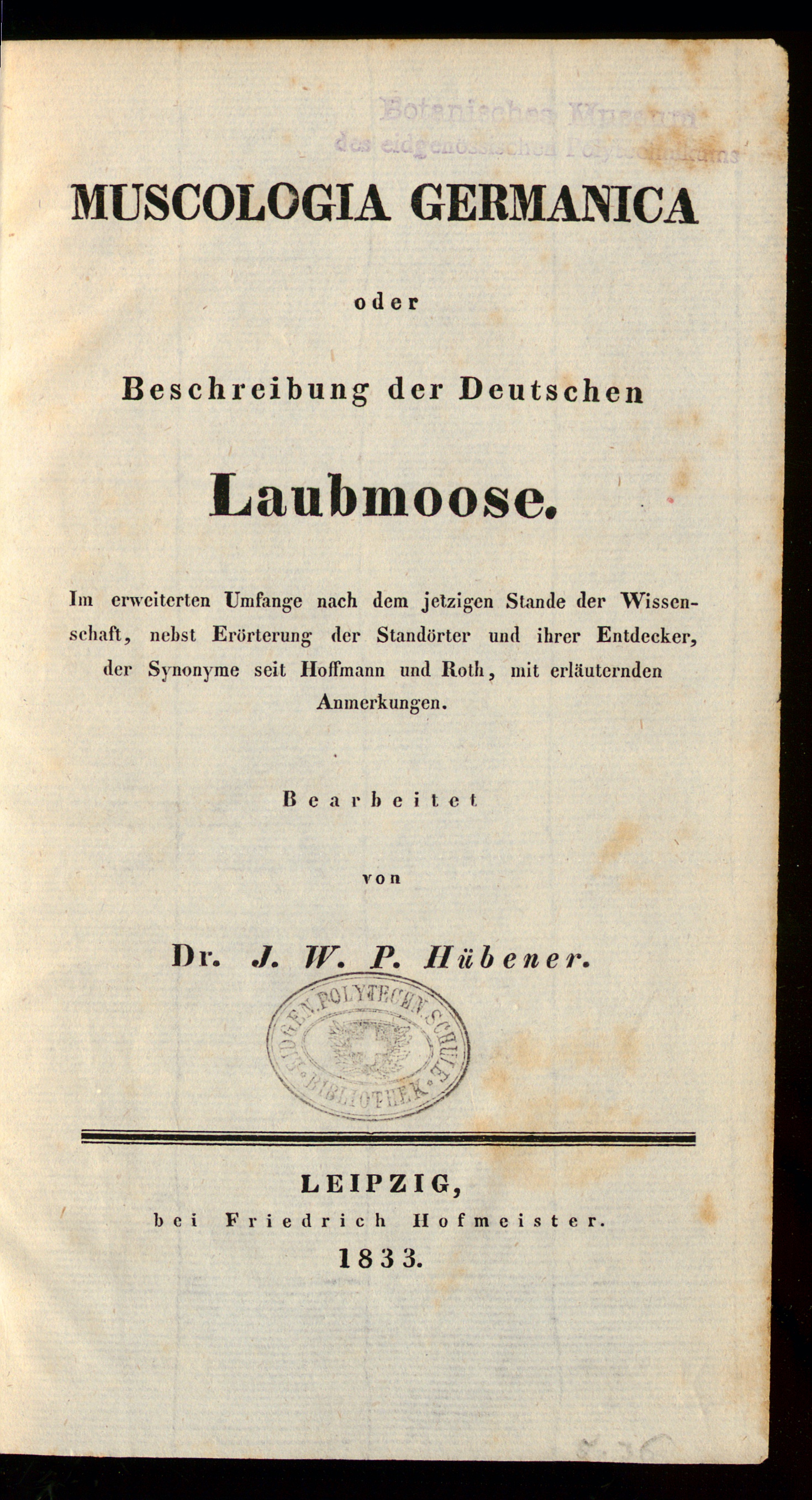 Muscologia Germanica oder Beschreibung der deutschen Laubmoose : im erweiterten Umfange nach dem jetzigen Stande der Wissenschaft, nebst Erörterung der Standörter und ihrer Entdecker der Synonyme seit Hoffmann und Roth, mit erläuternden Anmerkungen / bearb. von J.W.P. Hübener