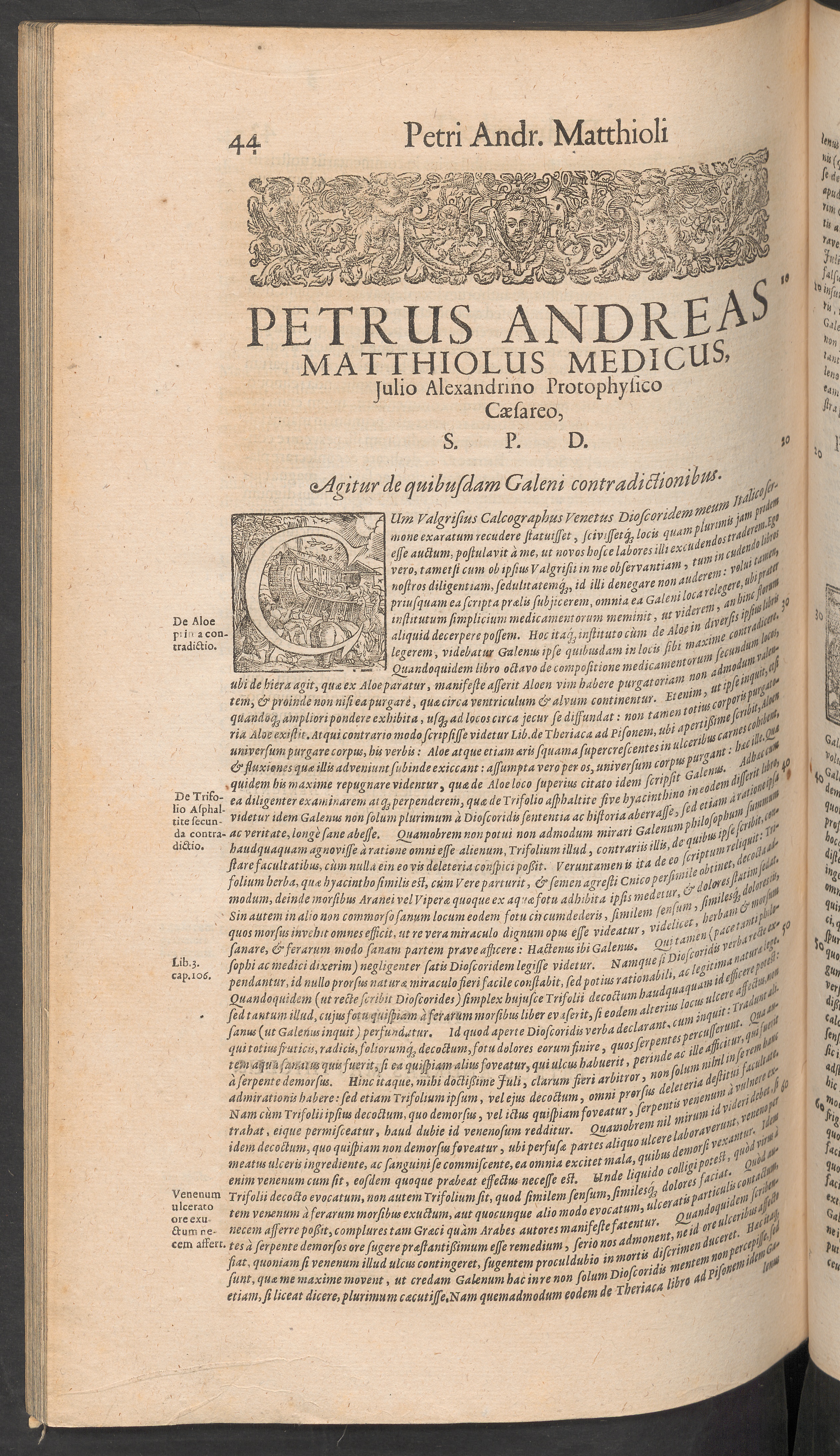 Petri Andreae Matthioli ... Opera quae extant omnia, hoc est, commentarii in VI. libros Pedacii Dioscoridis Anazarbei de medica materia, adjectis in margine variis graeci textus lectionibus ... qui Dioscoridis depravatam lectionem restituunt: a Casparo Bauhino ... Post diversarum editionum collationem infinitis locis aucti: Synonymiis quoque plantarum et notis illustrati: Adiectis plantarum iconibus ... De ratione distillandi aquas ex omnibus plantis ... item apologia in Amatum Lusitanum ... Epistolarum medicinalium ... Dialogus de morbo Gallico ...