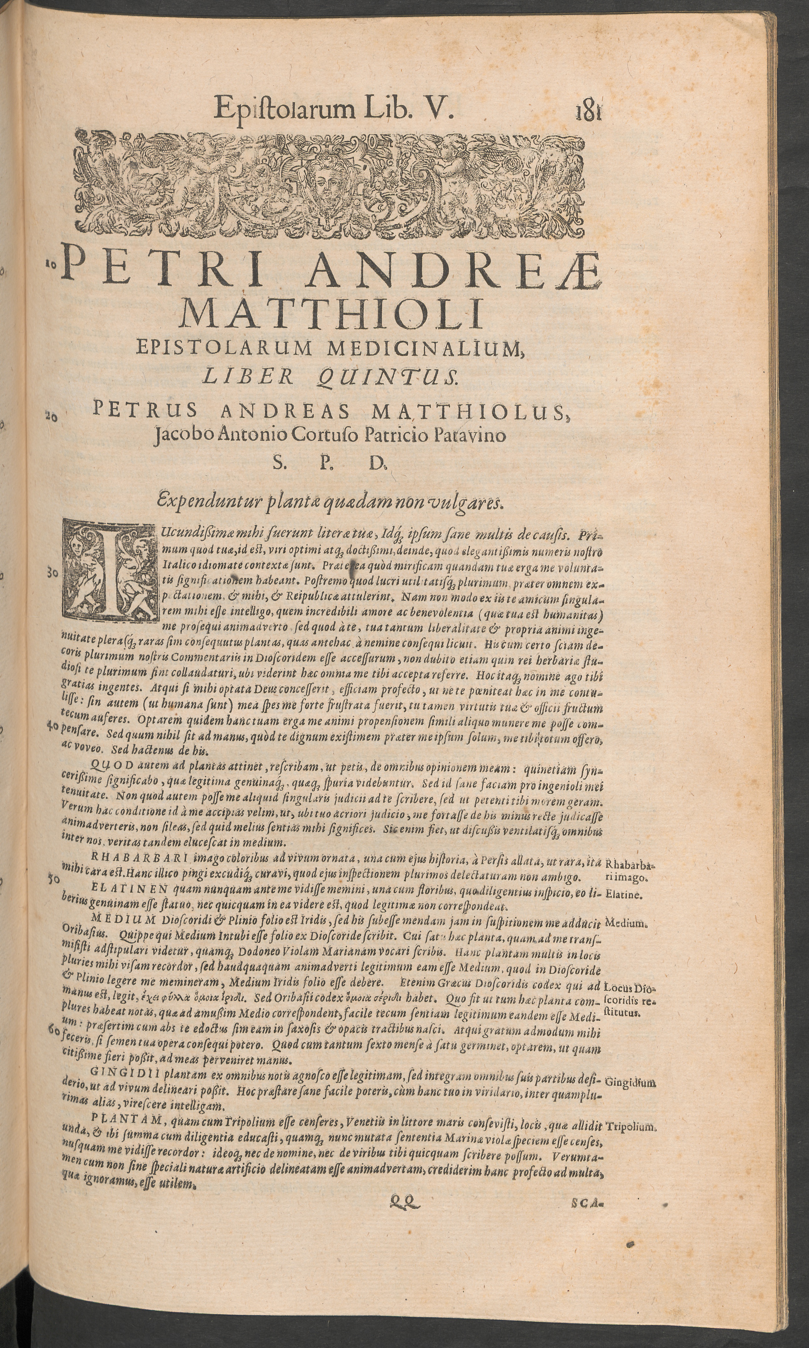 Petri Andreae Matthioli ... Opera quae extant omnia, hoc est, commentarii in VI. libros Pedacii Dioscoridis Anazarbei de medica materia, adjectis in margine variis graeci textus lectionibus ... qui Dioscoridis depravatam lectionem restituunt: a Casparo Bauhino ... Post diversarum editionum collationem infinitis locis aucti: Synonymiis quoque plantarum et notis illustrati: Adiectis plantarum iconibus ... De ratione distillandi aquas ex omnibus plantis ... item apologia in Amatum Lusitanum ... Epistolarum medicinalium ... Dialogus de morbo Gallico ...