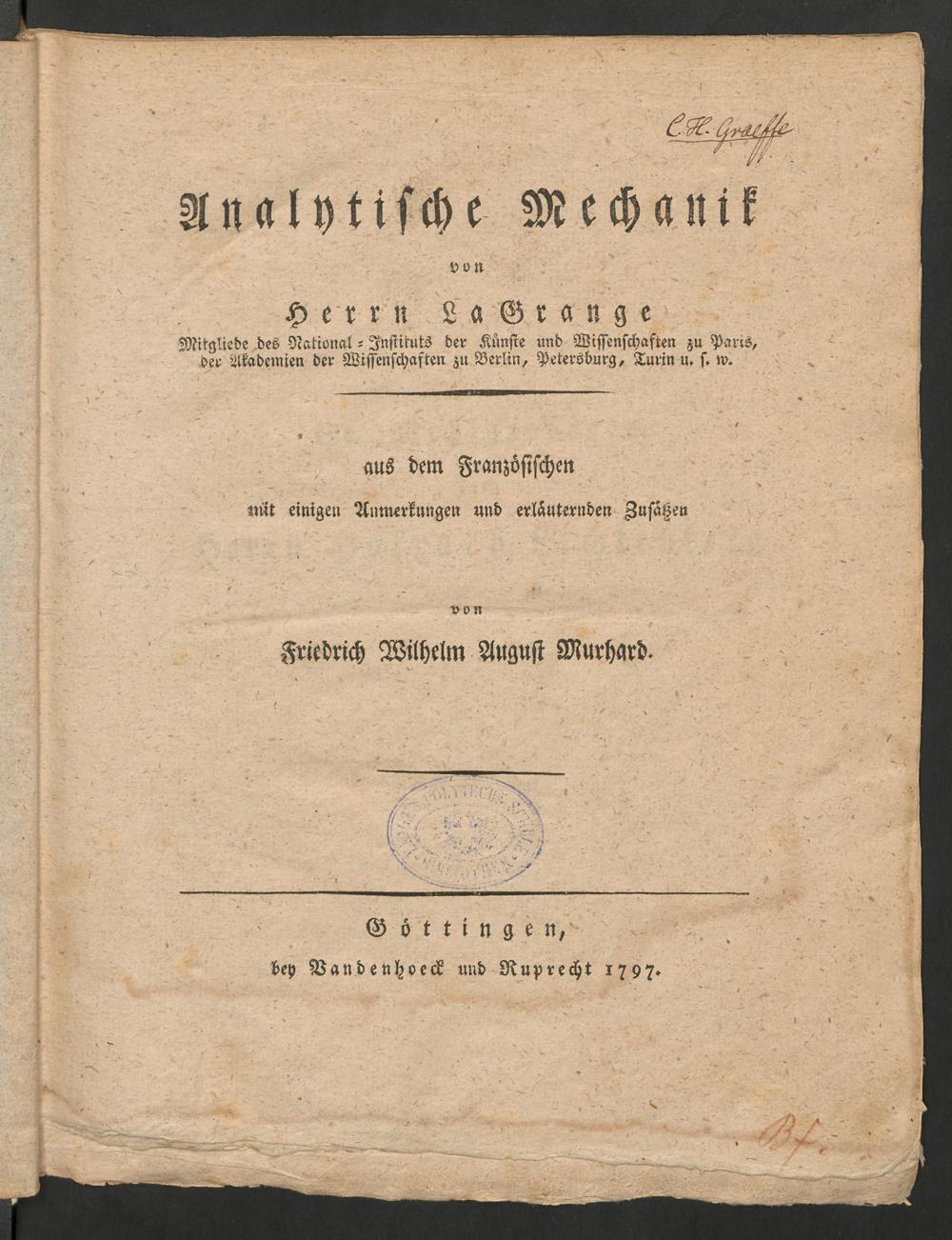 Analytische Mechanik / von ... Lagrange ; aus dem Französischen mit einigen Anmerkungen und erläuternden Zusätzen von Friedrich Wilhelm August Murhard