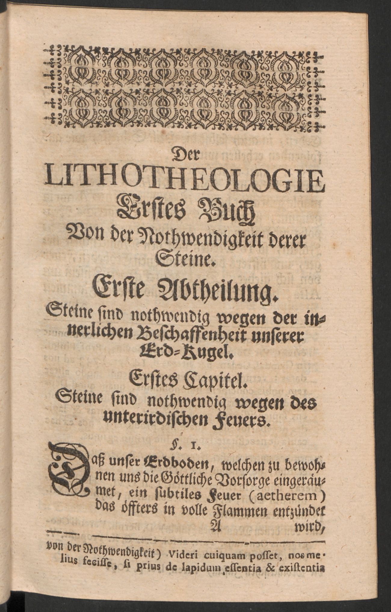 Friedrich Christian Lessers ... Lithotheologie, das ist: Natürliche Historie und geistliche Betrachtung derer Steine, also abgefasst, dass daraus die Allmacht, Weisheit, Güte und Gerechtigkeit des grossen Schöpffers gezeuget wird, anbey viel Sprüche der Heiligen Schrifft erklähret, und die Menschen allesamt zur Bewunderung, Lobe und Dienste des grossen Gottes ermuntert werden : zum Druck befordert und mit einer Vorrede begleitet von Johann Alberto Fabricio / Friedrich Christian Lesser ; zum Druck befordert und mit einer Vorrede begleitet von Johann Alberto Fabricio