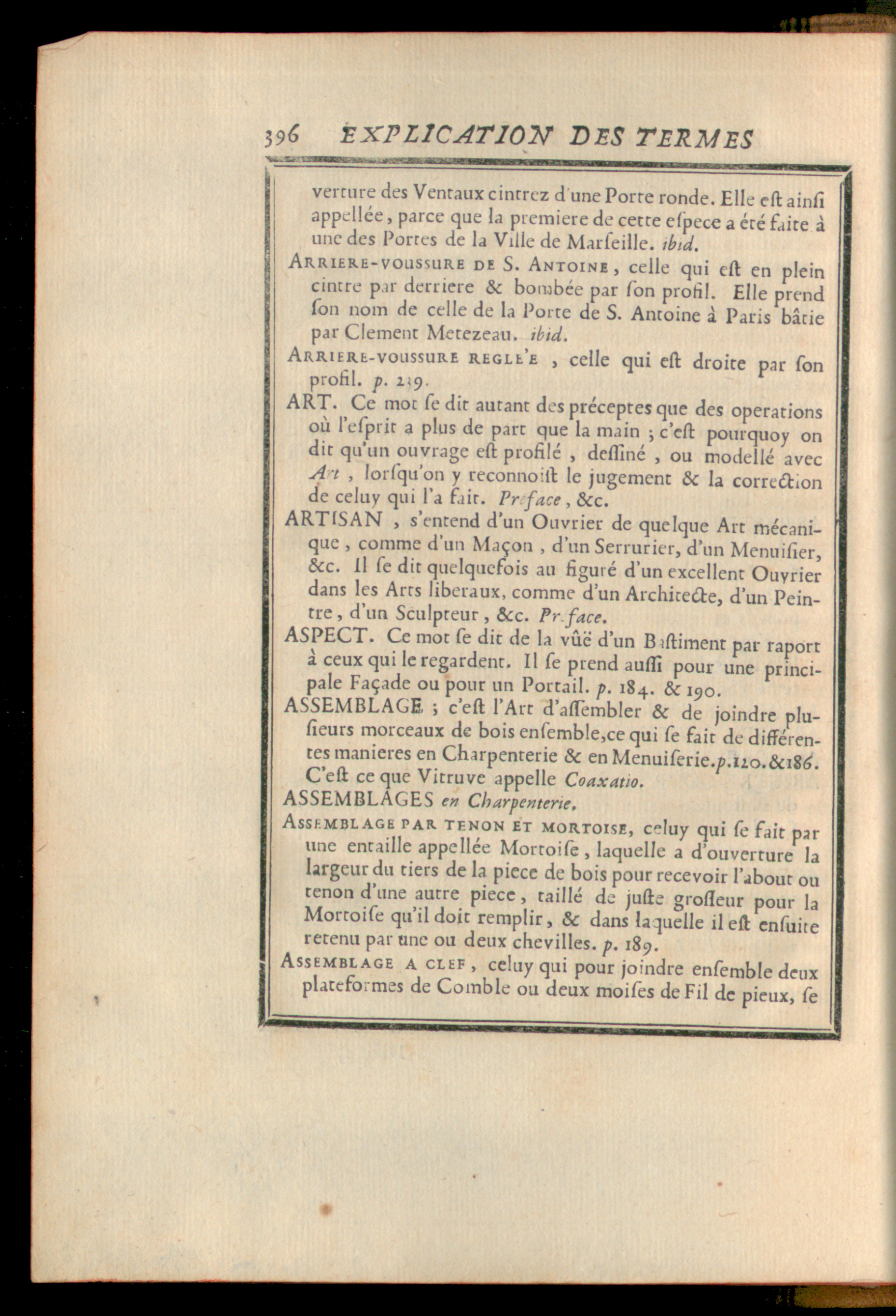 2 (1710) Explication des termes d'architecture : qui comprend l'architecture, les mathematiques, la geometrie, la mécanique; l'hydraulique, le dessein, la peinture, la sculpture ..., la maçonnerie, la coupe, et l'appareil des pierres ..., la vitrerie, la plomberie ..., le jardinage, & c., la distribution, la decoration, la matiere & la construction des edifices ... : les bastimens, antiques, sacrez, profanes ... : ensemble les etimologies, & les noms latins des termes, avec des exemples & des preceptes: le tout par raport à l'art de bâtir : suite du Cours d'architecture : aussi: Dictionnaire d'architecture / Augustin- Charles Daviler ...