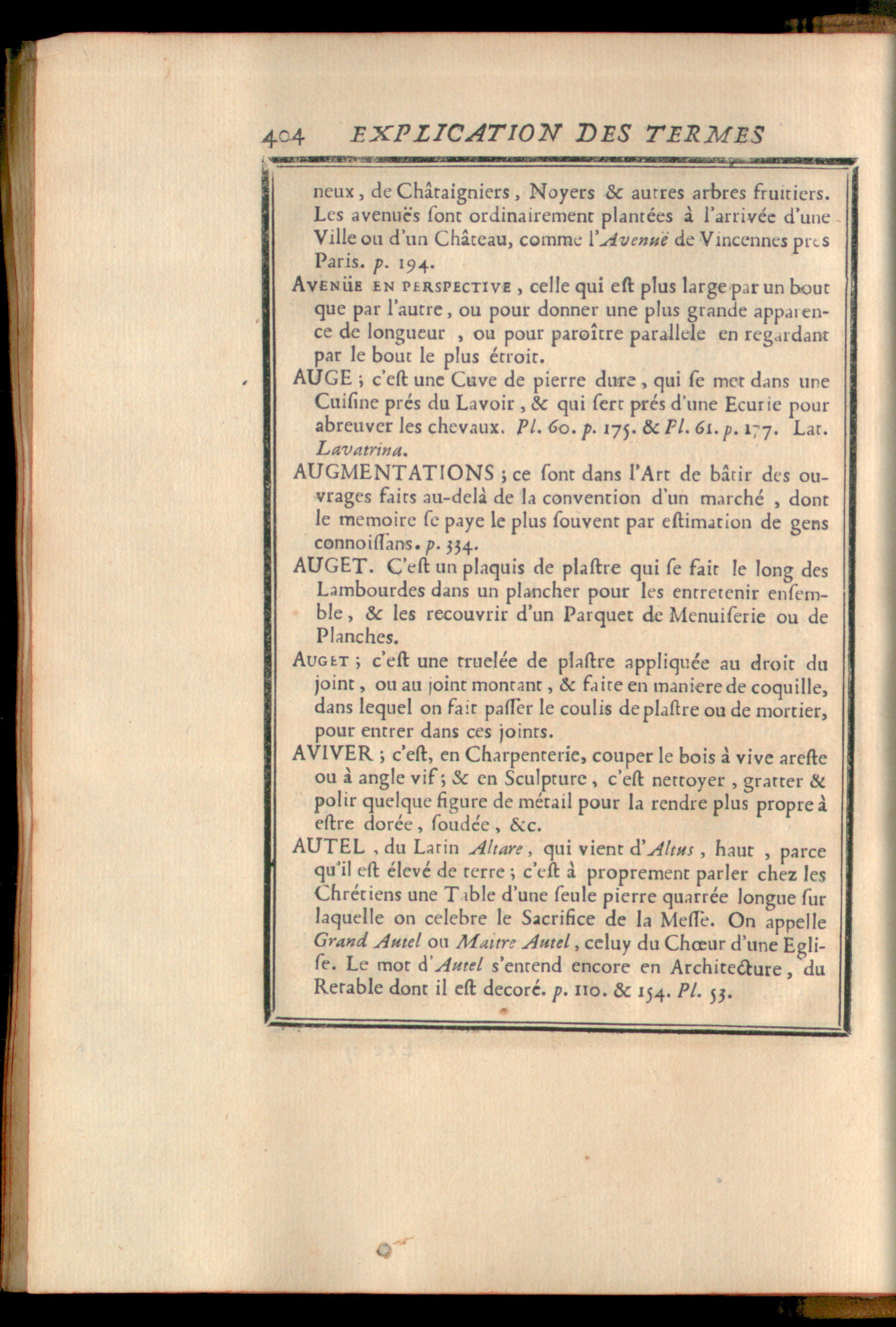 2 (1710) Explication des termes d'architecture : qui comprend l'architecture, les mathematiques, la geometrie, la mécanique; l'hydraulique, le dessein, la peinture, la sculpture ..., la maçonnerie, la coupe, et l'appareil des pierres ..., la vitrerie, la plomberie ..., le jardinage, & c., la distribution, la decoration, la matiere & la construction des edifices ... : les bastimens, antiques, sacrez, profanes ... : ensemble les etimologies, & les noms latins des termes, avec des exemples & des preceptes: le tout par raport à l'art de bâtir : suite du Cours d'architecture : aussi: Dictionnaire d'architecture / Augustin- Charles Daviler ...