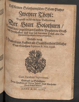 Der klein Solothurner allgemeine Schaw-Platz historischer Geist- auch weltlicher vornembsten Geschichten und Händlen : welche sich von Anfang der Welt biss auff gegenwärtige Zeit in Helvetien, Teutschland Franckreich, Italien, Spanien, Engelland, auch andern Orthen zugetragen ... / durch Franciscum Haffner