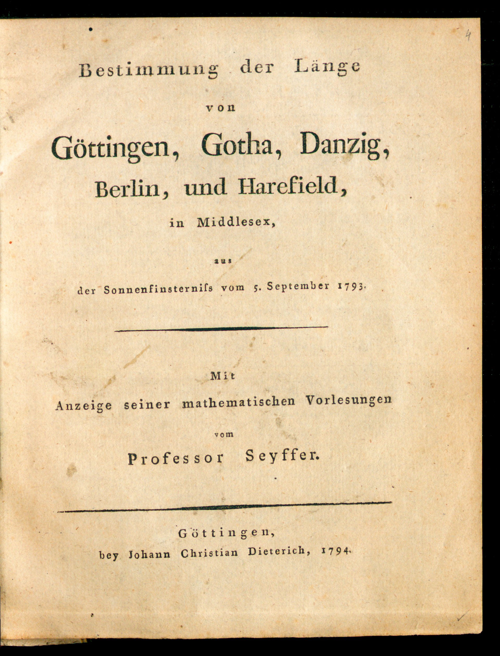 Bestimmung der Länge von Göttingen, Gotha, Danzig, Berlin, und Harefield in Middlesex aus der Sonnenfinsterniss vom 5. September 1793 / [Karl Felix von Seyffer]