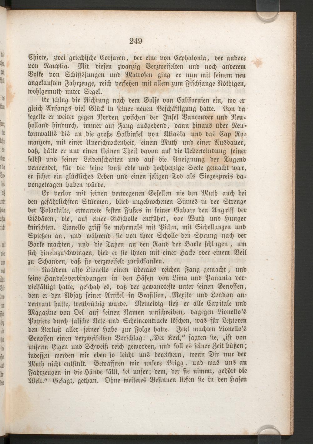 Chiote, zwei griechische Corsaren, der eine von Cephalonia, der anderevon Nauplia- Mit diesen zwanzig Verzweifelten und noch anderemVolke von Schiffsjungen und Matrosen ging er nun mit seinem neuangekauften Fahrzeuge, reich versehen mit allem zum Fischfänge Nöthigen,wohlgemuth unter Segel.