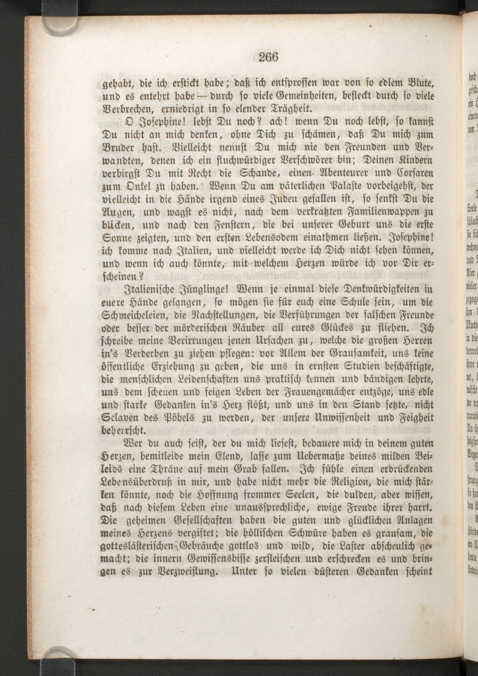 O Josephine! lebst Du noch? ach! wenn Du noch lebst, so kannst ""Du nicht an mich denken, ohne Dich zu schämen, daß Du mich zumBruder hast. Vielleicht nennst Du mich nie den Freunden und Ver-wandten, denen ich ein fluchwürdiger Verschwörer bin: Deinen Kindernverbirgst Du mit Recht die Schande, einen Abenteurer und Corsarenzum Onkel zu haben. Wenn Du am väterlichen Palaste vorbeigehst, der ,