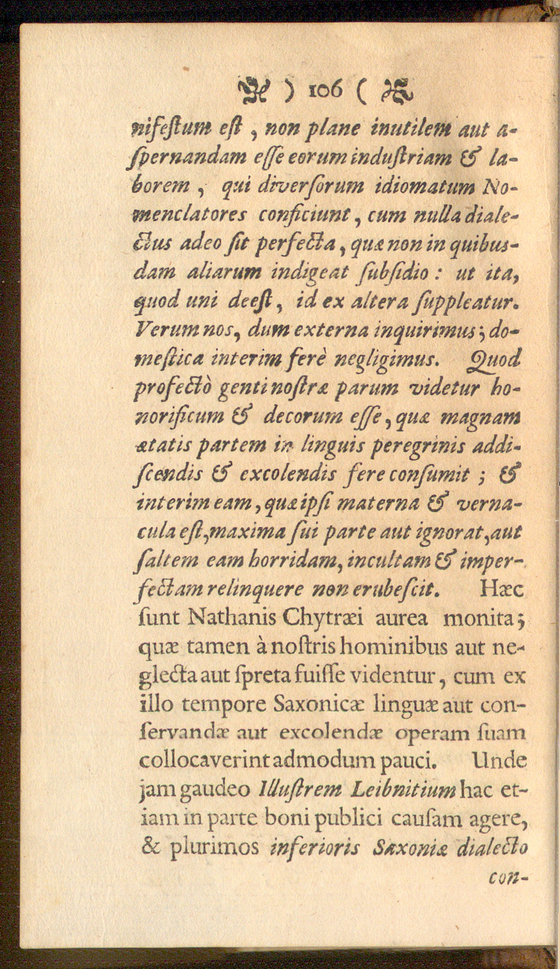 sunt Nathanis Chytrad aurea monita z ;quas tamen ä nostris hominibus aut ne-glecta aut spreta fuisse videntur, cum exillo tempore Saxonica: linguas aut con-servanda’ aut excolenda? operam luamcollocaverint admodum pauci. Unde !jam gaudeo Illustrem Leibnitium hac et-iam in parte boni publici causam agere,