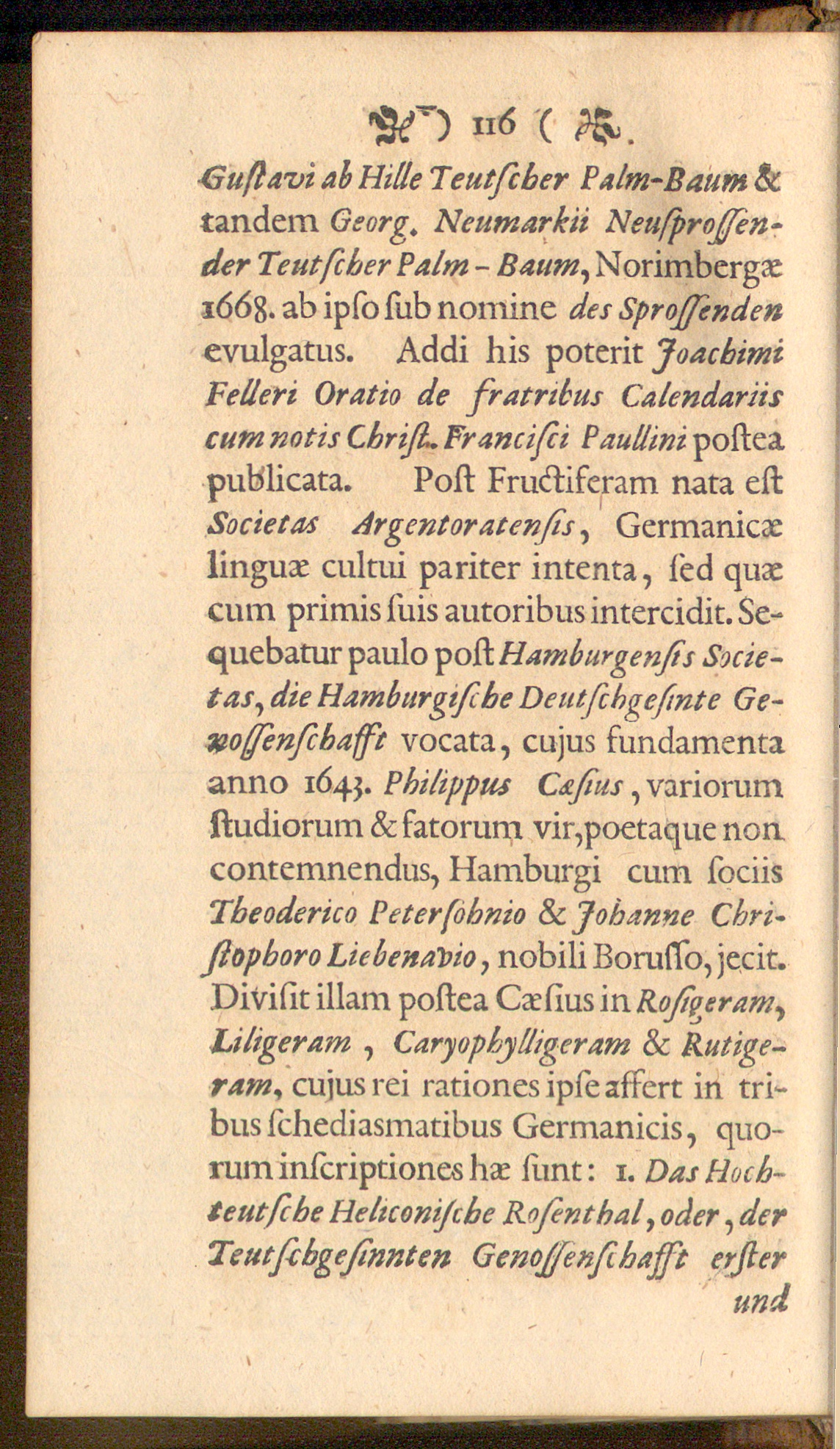 Guß avi ab Hille Teutscher Palm-Baum &tandem Georg . Neumarkti Neufprossen-der Teutscher Palm - Baum , Norimbergaei66z. ab ipso sub nomine dtr Sprossendenevulgatus. Addi his poterit JoacbtmiFelleri Oratio de fratribus Calendariiscum notis CbriJL Francisi Paullini posteapublicata. Post Fructiferam nata estSocietas Argentoratenfis , Germanicaelinguae cultui pariter intenta, sed quaecum primis suis autoribus intercidit. Se-quebatur paulo post Hamburgenfis Socie-tas , die Hamburgisbe Deutschgesinte Ge-wssenscbafft vocata, cujus fundamentaanno 1645. Philippus Casus , variorumstudiorum & fatorum vir,poetaque noncontemnendus, Hamburgi cum sociisTbeoderico Peter föhnio & Johanne Cbri-ßopboro Liebenatoio , nobili Borusto, jecit.Divisit illam postea Caesius in Rofigjram , j