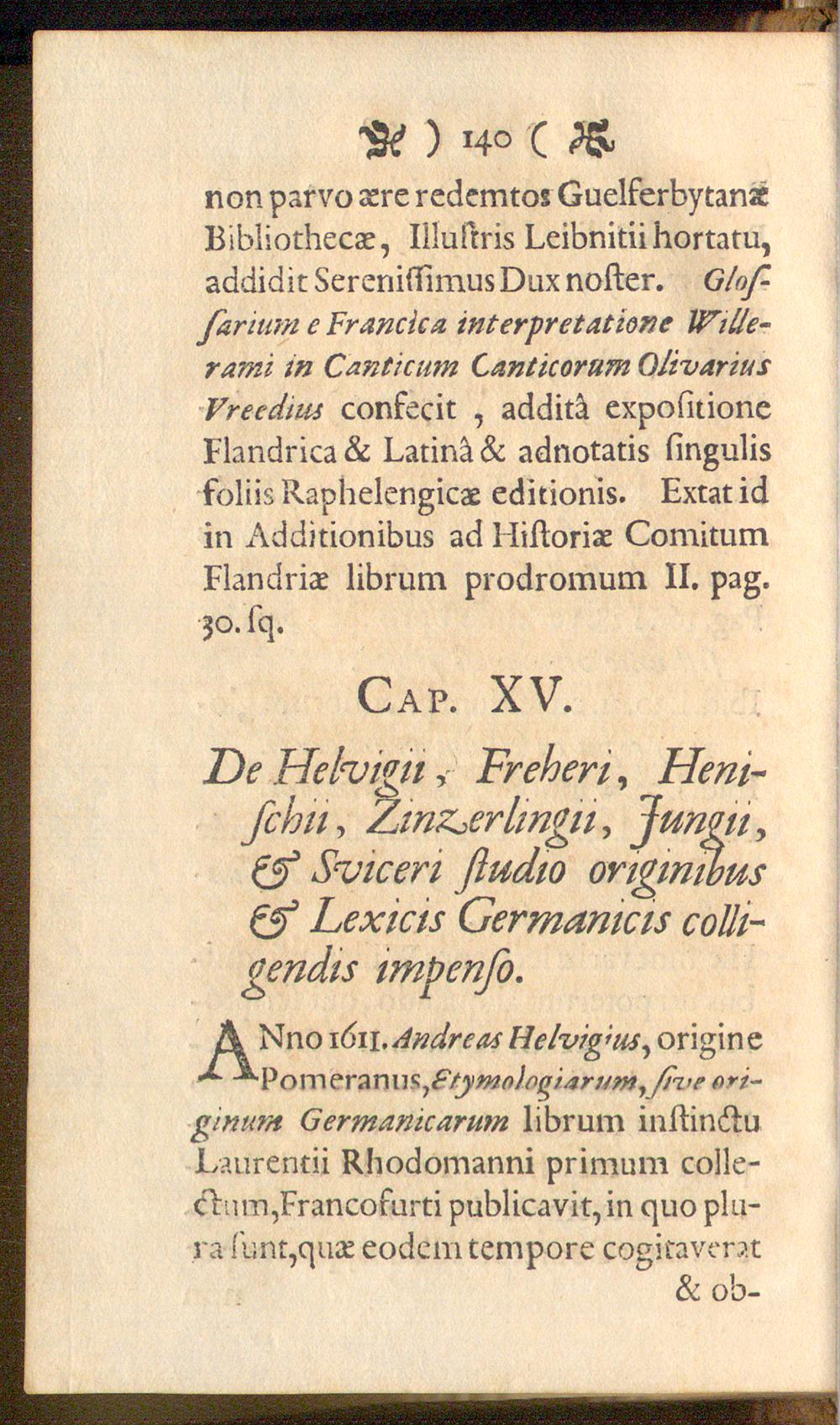 non parvo aere redemtos GuelferbytanaeBibliothecae, Illustris Leibnitiihortatu,addidit Serenissimus Dux noster. Glos-sarium e Francica interpretatione Wille-rami in Canticum Canticorum OlivariusVreedms confecit , additä expositioneFlandrica & Latinä & adnotatis singulisfoliis Raphelengicae editionis. Extat idin Additionibus ad Historiae ComitumFlandriae librum prodromum II. pag.30. sq.