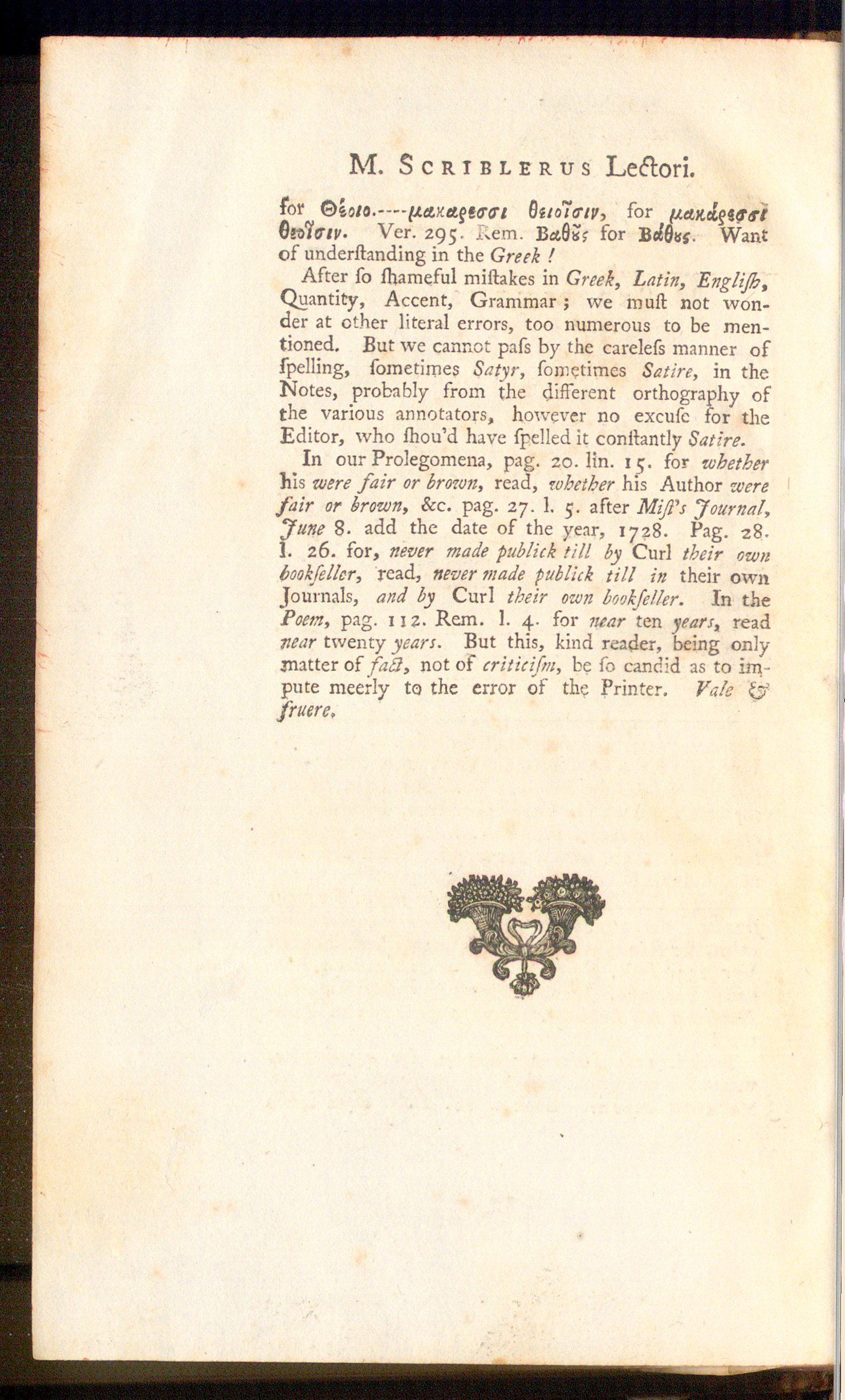 In our Prolegomena, pag. 20. lin. 15. for whetherhis were fair or brmvn, read, whether his Author werefair or brown, Sec. pag. 27. 1 . 5. after Mist's Journal,June 8- add the date of the year, 1728. Pag. 28.1 . 26. for, never made fublick till by Curl their ownbookseller, read, never made fublick till in their ownJournals, and by Curl their own bookseller. In thePoem, pag. 112. Rem. 1 . 4. for mar ten years, readnear twenty years. But this, kind reader, being onlymatter of fa 3 , not of criticism, be so candid as to im-pute meerly to the error of the Printer. Vale Iffruere.