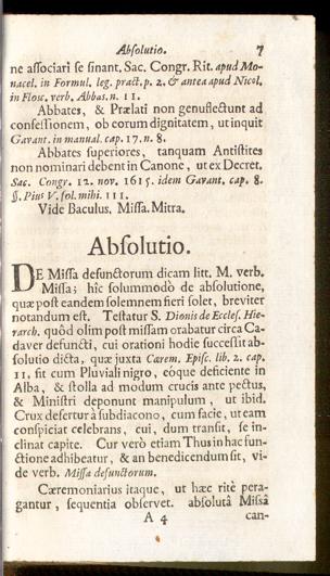 P' Missa 5 hic solummodo de absolutione,quas post eandem solemnem fieri solet, breviternotandum est. Testatur 8 . Dionis de Ecclef. Hie-rauf). quöd olim post missam orabatur circa Ca-daver defuncti, cui orationi hodie successit ab-solutio dicta, quae juxta Carem. Epifc. lib. 2, cap.n, sit cum Pluviali nigro, eoque deficiente inAlba, & stoila ad modum crucis ante pectus,& Ministri deponunt manipulum , ut ibid.Crux defertur a fiibdiacono, cum facie, ut eamconfpiciat celebrans, cui, dum transit, fe in-clinat capite. Cur verb etiam Thus in hac fun-ctione adhibeatur, & an benedicendum sit, vi-de verb. Miffa defunttorum.