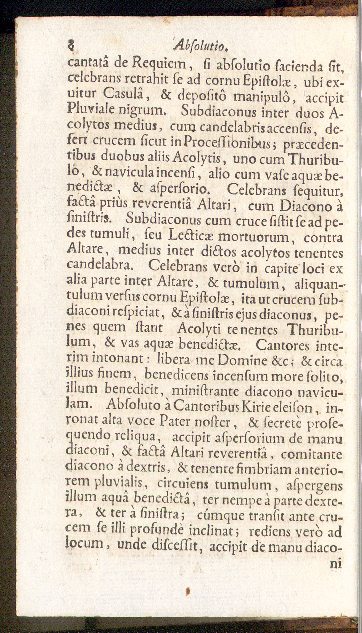 cantata de Requiem , si absolutio facienda sit,celebrans retrahit se ad cornu Epistolae, ubi ex-uitur Casula, & deposito manipulo, accipitPluviale nigrum, Subdiaconus inter duos A-colytos mediuj, cura candelabris accensis, de-fert crucem sicut in Processionibus; praeceden-tibus duobus aliis Acolytis, uno cumThuribu-lo, & navicula incensi, alio cum vase aquae be-nedictae , & aspersorio. Celebrans sequitur,facta prius reverentia Altari, cum Diacono asinistris. Subdiaconus cum cruce sistit se ad pe-des tumuli, seu Lecticae mortuorum, contraAltare, medius inter dictos acolytos tenentescandelabra. Celebrans vero in capite loci exalia parte inter Altare, & tumulum, aliquan-tulum versus cornu Epistolae, ita ut crucem sub-diaconirespiciat, 8ta sinistris ejus diaconus, pe-nes quem stant Acolyti tenentes Thuribu-lum, & vas aquae benedictae. Cantores inte-rim intonant: libera me Domine &c; & circaillius sinem, benedicens incensum more (blito,illum benedicit, ministrante diacono navicu-lam. Absoluto a Cantoribus Kirieeleison, in-tonat alta voce Pater noster, & secrete prose-