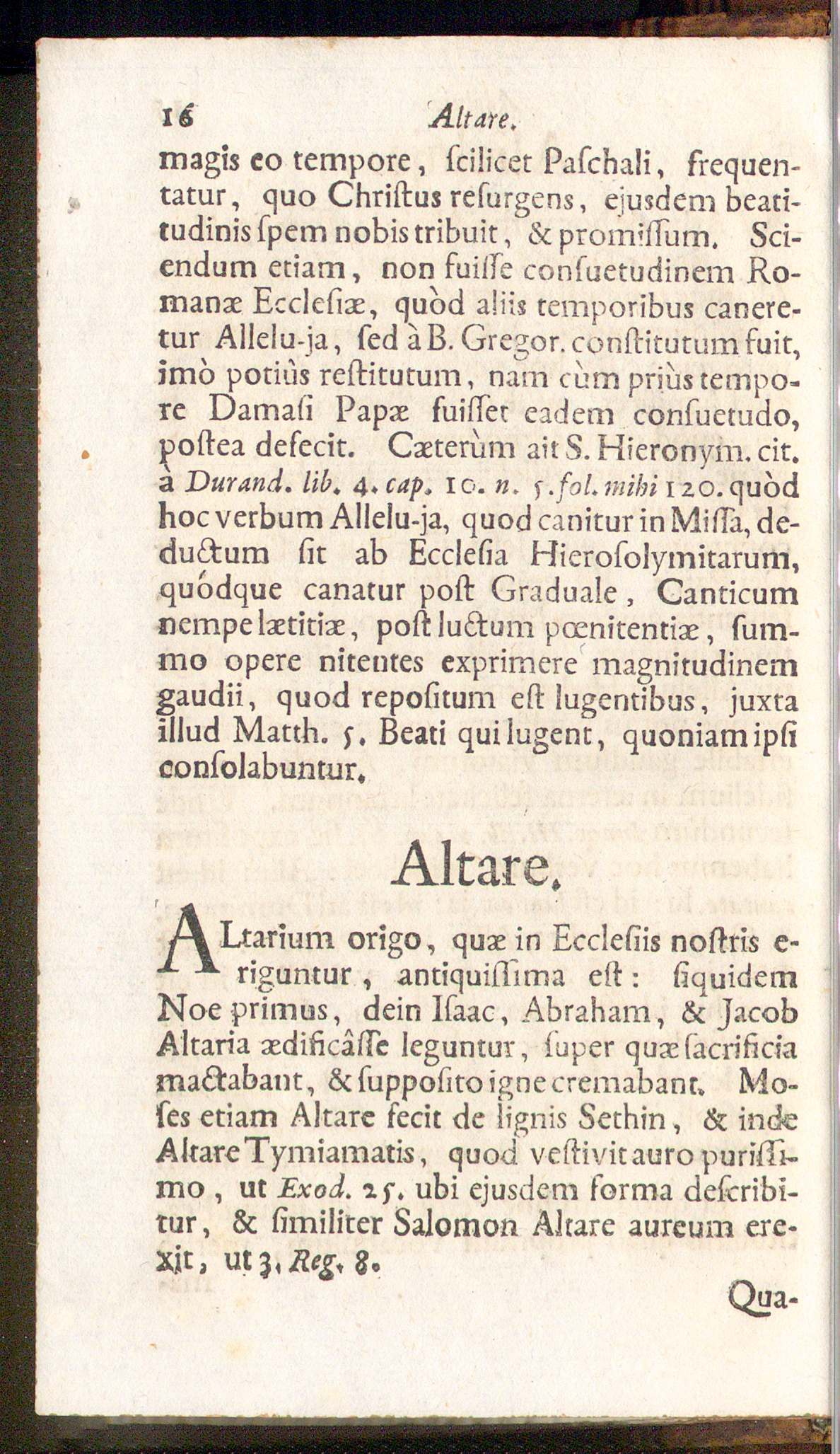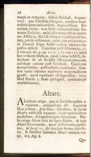 J\ Darium origo, quae in Ecclesiis nostris e-figuntur , antiquissima est: siquidem jNoe primus, dein Isaac, Abraham , & JacobAltaria aedificasse leguntur, super quae(acrificiamactabant, & supposito ignecremabant, Mo-ses etiam Altare fecit de lignis Sethin, & inde i(Altare Tymiamatis, quod vestivit auro purissi- |mo , ut Exod. ay. ubi ejusdem forma describi-tur , & similiter Salomon Altare aureum ere-Xjt, ut 3, Reg, 8.