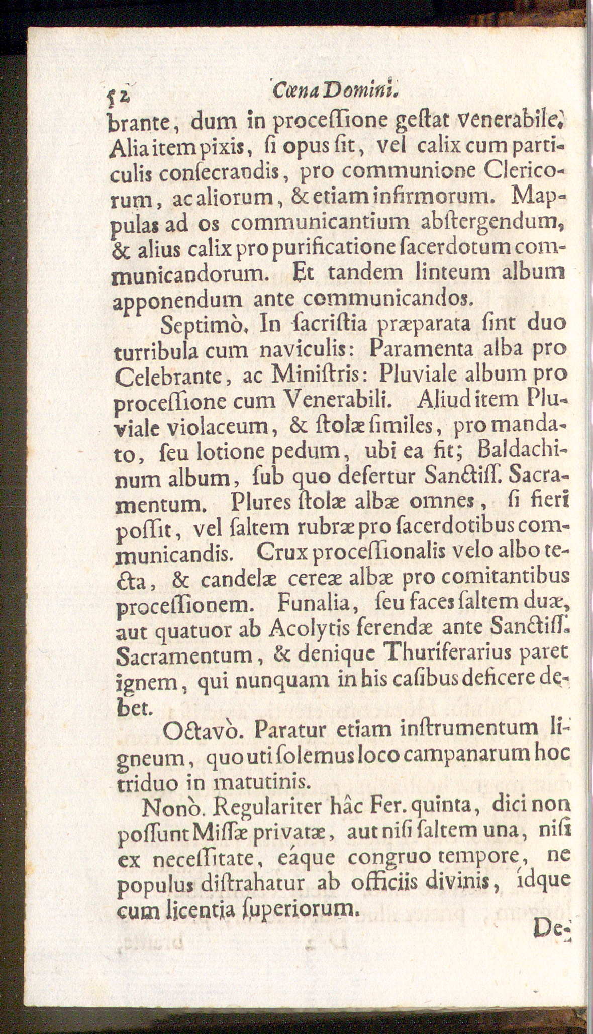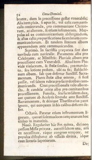 Septimo, In iacristia praeparata sint duoturribula cum naviculis: Paramenta alba proCelebrante, ac Ministris: Pluviale album proprocessione cum Venerabili. Aliud item Plu-viale violaceum, & stolae similes, pro manda-to, seu lotione pedum, ubi ea fit; Baldachi-num album, sub quo defertur Sanctiss. Sacra-mentum. Plures stolae albae omnes, si fieripossit, vel saltem rubrae pro sacerdotibus com-municandis. Crux processionalis velo albo te-cta , & candelae cereae albae pro comitantibusprocessionem. Funalia, seu faces saltem duae,aut quatuor ab Acolytis serendae ante Sancti/ESacramentum, & denique Thuriferarius paretignem, qui nunquam in bis casibus deficere de-bet.