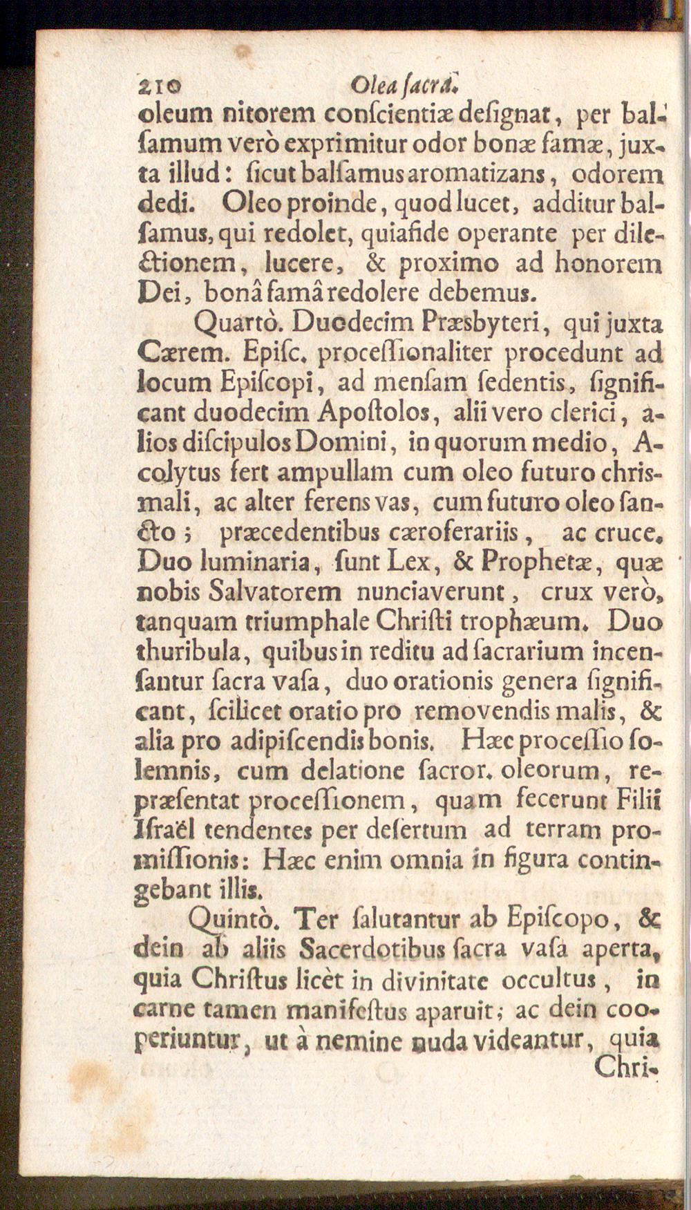 Quarto. Duodecim Praesbyteri, qui juxtaCaerem. Epifc. proceiTionaliter procedunt adlocum Episcopi, ad mensam sedentis, signifi-cant duodecim Apostolos, alii vero clerici, a-lios discipulos Domini, in quorum medio, A-colytus fert ampullam cum oleo futuro chris-mali, ac alter ferens vas, cum futuro oleo san-cto ; praecedentibus caeroferariis, ac cruce.Duo luminaria, sunt Lex, & Prophetae, quaenobis Salvatorem nuntiaverunt, crux vero,tanquam triumphale Christi trophaeum. Duothuribula, quibus in reditu ad sacrarium incen-santur sacra vasa, duo orationis genera signifi-cant, scilicet oratio pro removendis malis, &alia pro adipiscendis bonis. Haec processio so-lemnis, cum delatione sacror, oleorum, re-praesentat processionem, quam fecerunt FiliiIsraifl tendentes per desertum ad terram pro-missionis: Haec enim omnia in figura contin-gebant illis.