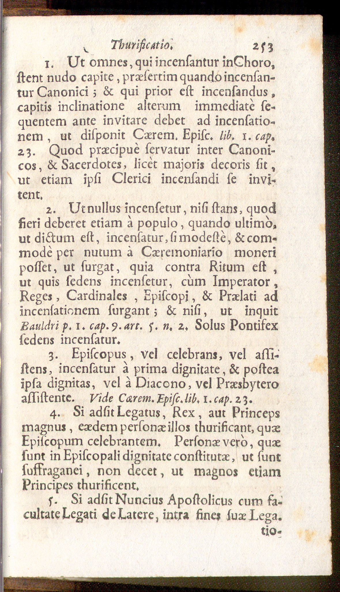 2. Ut nullus incensetur, nisi stans, quodfieri deberet etiam a populo, quando ultimo,ut dictum est, incensatur,simodeste, & com-mode per nutum ä Caeremoniario moneriposset, ut surgat, quia contra Ritum est ,ut quis sedens incensetur, cum Imperator,Reges, Cardinales , Episcopi, & Praelati adincensationem surgant; & nisi, ut inquitBauldrip. 1. cap. ?. an. 5. », 2. Solus Pontifexsedens incensatur.