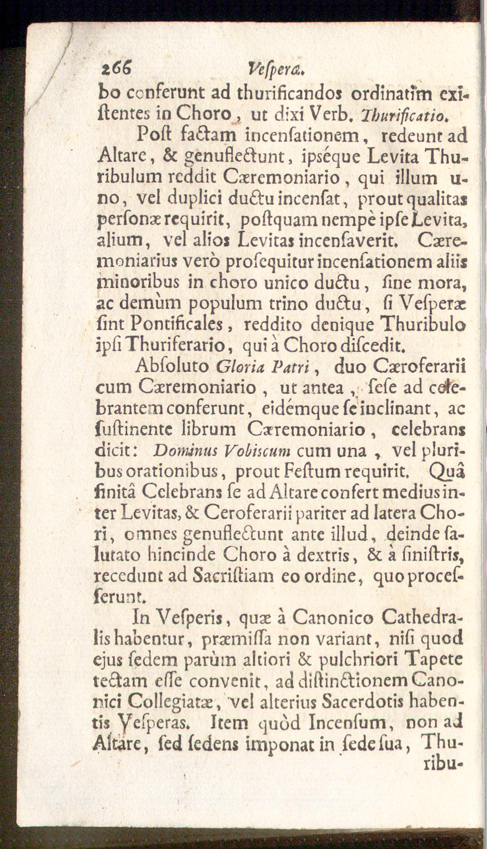 In Vesperis, quae a Canonico Cathedra-lishabentur, praemista non variant, nisi quodejus sedem parum altiori & pulchriori Tapetetectam este convenit, ad distinctionem Cano-nici Collegiatae, vel alterius Sacerdotis haben-tis Ycsperas. Item quod Incensum, non adAltare, sed sedens imponat in sede sua, Thu-