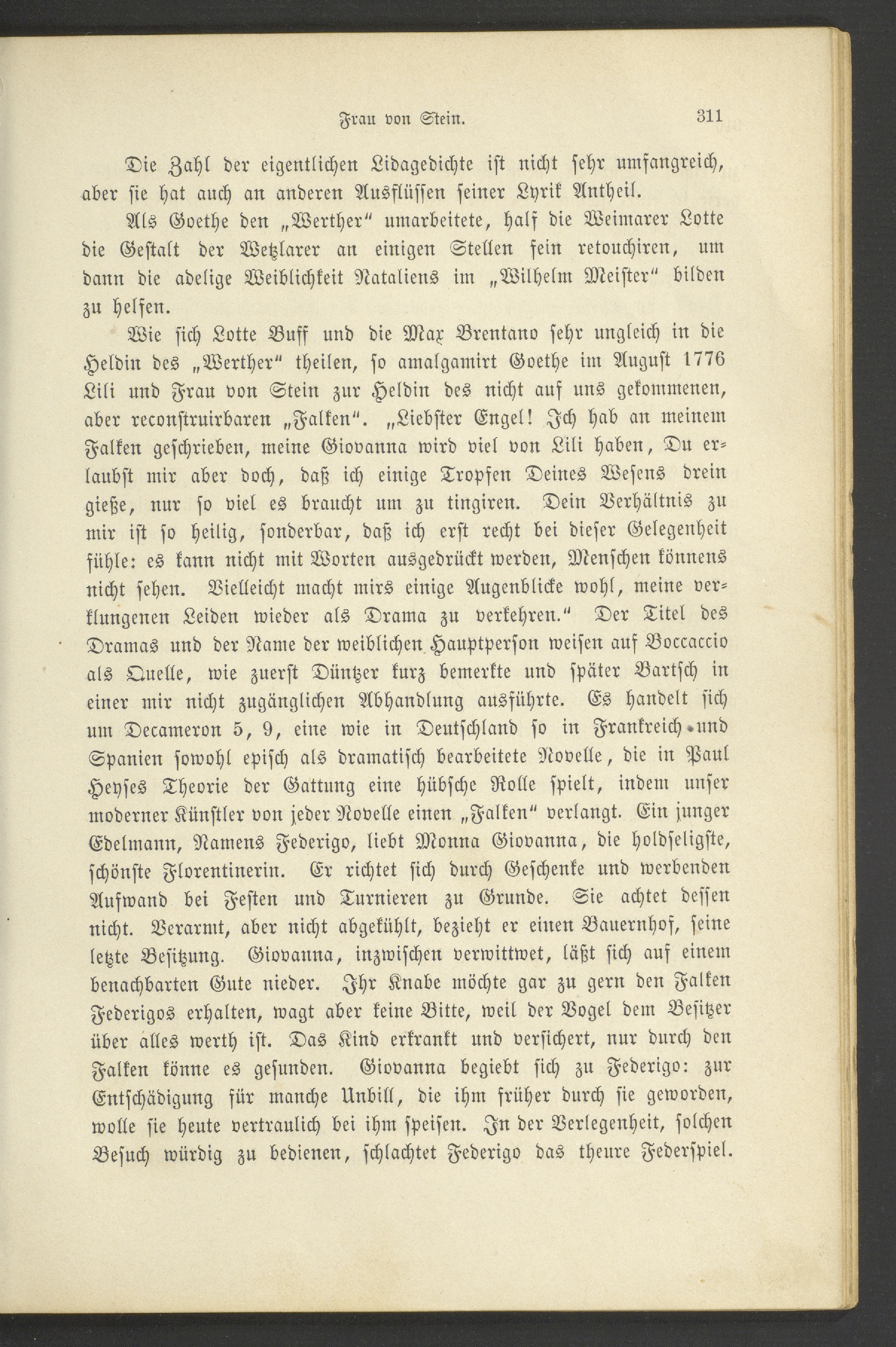 Wie sich Lotte Buff und die Max Brentano sehr ungleich in dieHeldin des „Werther" theilen, so amalgamirt Goethe im August 1776Lili und Frau von Stein zur Heldin des nicht auf uns gekommenen,aber reconstruirbaren „Falken". „Liebster Engel! Ich hab an meinemFalken geschrieben, meine Giovanna wird viel von Lili haben, Du er-laubst mir aber doch, daß ich einige Tropfen Deines Wesens dreingieße, nur so viel es braucht um zu tingiren. Dein Verhältnis zumir ist so heilig, sonderbar, daß ich erst recht bei dieser Gelegenheitfühle: es kann nicht mit Worten ausgedrückt werden, Menschen könnensnicht sehen. Vielleicht macht mirs einige Augenblicke wohl, meine ver-klnngenen Leiden wieder als Drama zu verkehren." Der Titel desDramas und der Name der weiblichen Hauptperson weisen auf Boccaccioals Quelle, wie zuerst Düntzer kurz bemerkte und später Bartsch ineiner mir nicht zugänglichen Abhandlung ausführte. Es handelt sichum Decameron 5, 9, eine wie in Deutschland so in Frankreich »undSpanien sowohl episch als dramatisch bearbeitete Novelle, die in PaulHeyses Theorie der Gattung eine hübsche Rolle spielt, indem unsermoderner Künstler von jeder Novelle einen „Falken" verlangt. Ein jungerEdelmann, Namens Federigo, liebt Monna Giovanna, die holdseligste,schönste Florentinerin. Er richtet sich durch Geschenke und werbendenAufwand bei Festen und Turnieren zu Grunde. Sie achtet dessennicht. Verarmt, aber nicht abgekühlt, bezieht er einen Bauernhof, seineletzte Besitzung. Giovanna, inzwischen verwittwet, läßt sich auf einembenachbarten Gute nieder. Ihr Knabe möchte gar zu gern den FalkenFederigos erhalten, wagt aber keine Bitte, weil der Vogel dem Besitzerüber alles werth ist. Das Kind erkrankt und versichert, nur durch denFalken könne es gesunden. Giovanna begiebt sich zu Federigo: zurEntschädigung für manche Unbill, die ihm früher durch sie geworden,wolle sie heute vertraulich bei ihm speisen. In der Verlegenheit, solchenBesuch würdig zu bedienen, schlachtet Federigo das theure Federspiel.