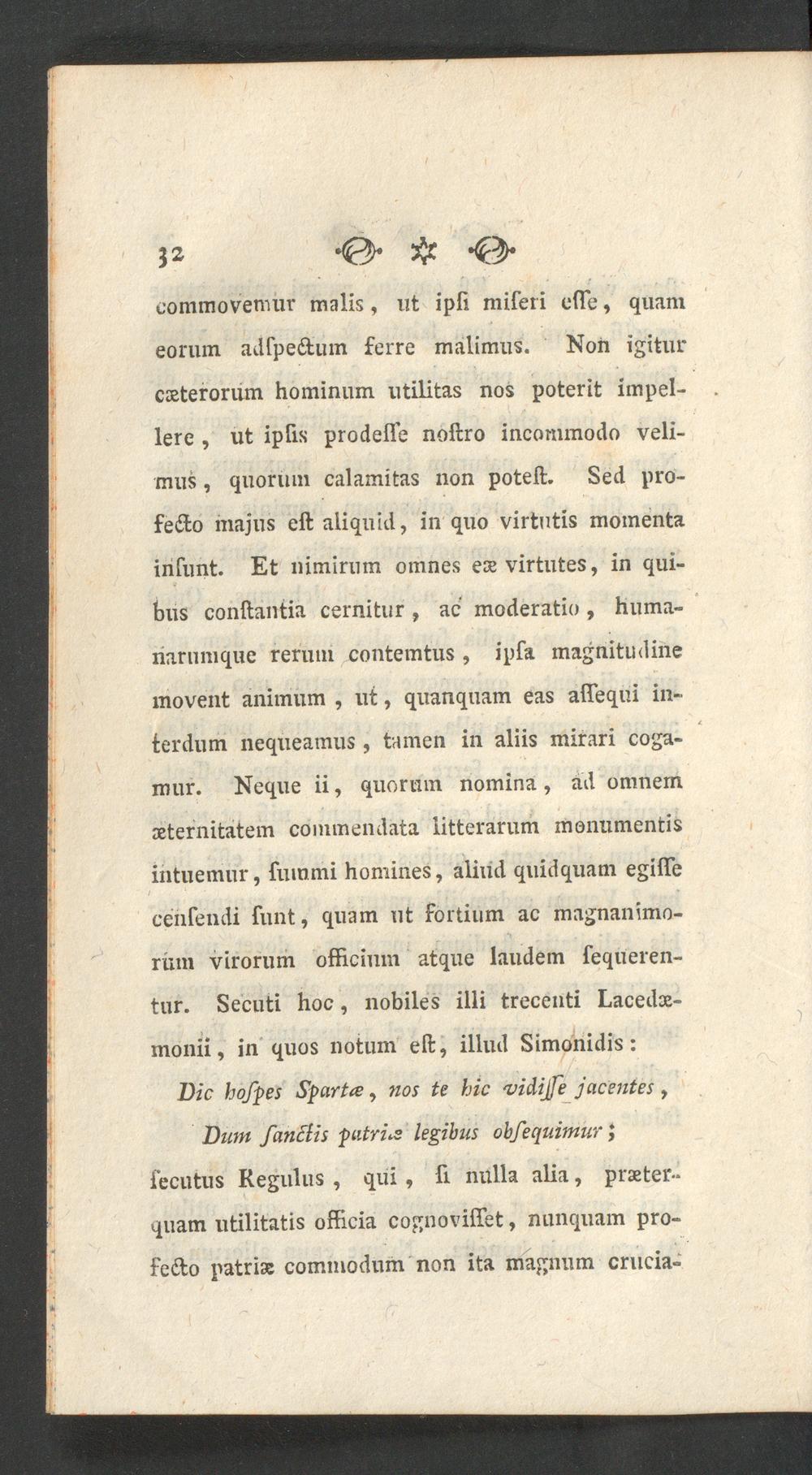 Dic hofpes Sparta , nos te hic vidijfe jacentes ,Dum fan£lis patria legibus obfequimursecutus Regulus , qui , fi nulla alia, praeter-quam utilitatis officia cognoviffet, nunquam pro-fefto patriae commodum non ita magnum crucia-