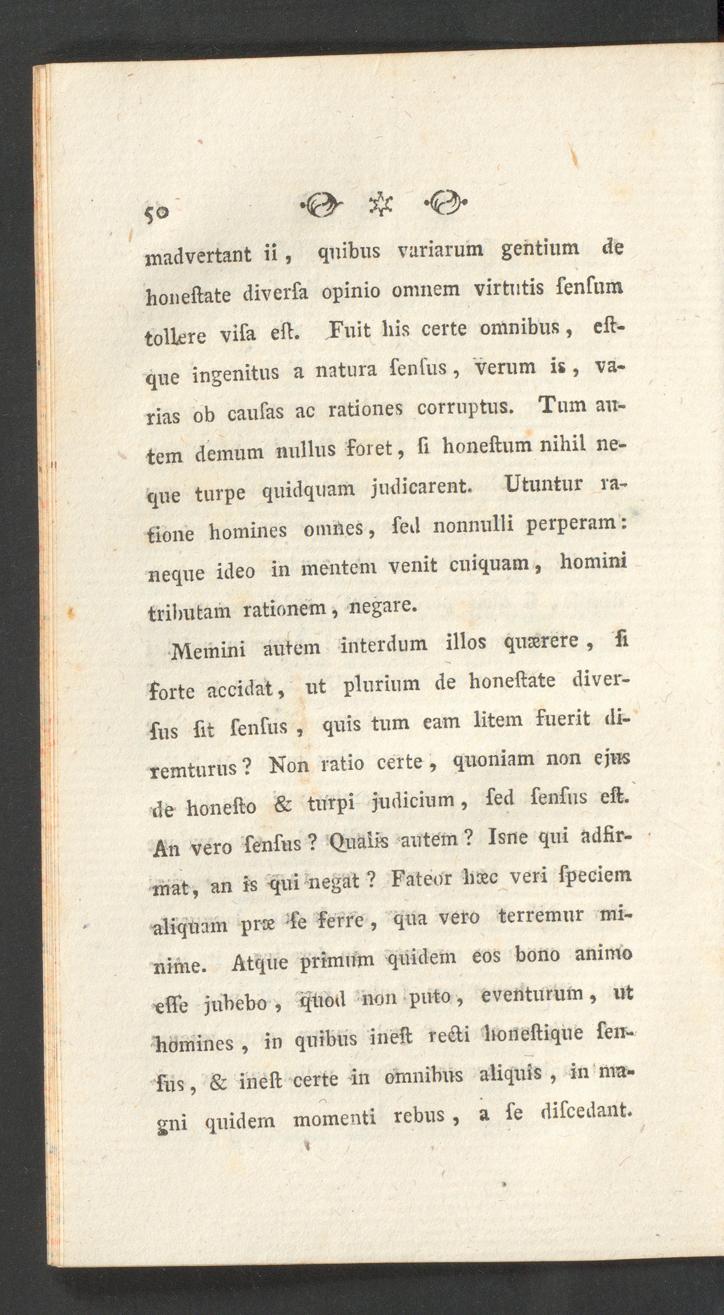 Memini autem interdum illos quxrere, fiforte accidat, ut plurium de honeftate diver-fus fit fenfus , quis tum eam litem fuerit di-remturus ? Non ratio certe, quoniam non ejusde honefto & turpi judicium, fed fenfus eft.An vero fenfus ? Qualis autem ? Isne qui adfir-mat, an is qui negat ? Fateor hxc veri fpeciemaliquam prse : fe ferre, qua vero terremur mi-nime. Atque primum quidem eos bono animotffe jubebo, quod non puto, eventurum, uthomines , in quibus in eft redi honeftique ten-tus , & ineft certe in omnibus aliquis, in ma-gni quidem momenti rebus, a fe difcedant.