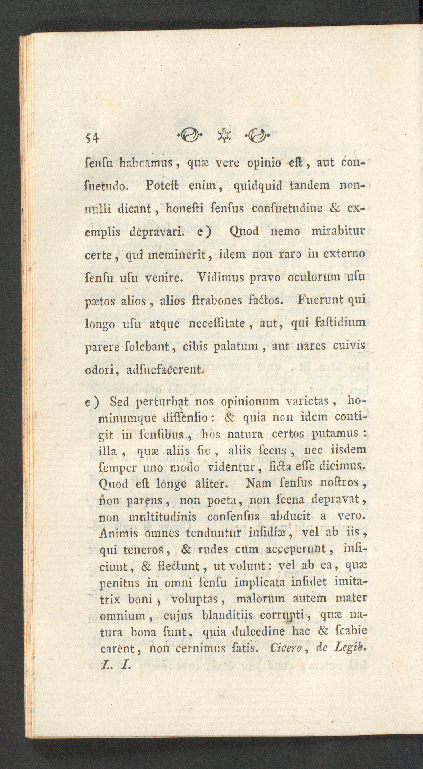 e ) Sed perturbat nos opinionum varietas , ho-minumque dilfenlio: & quia ncn idem conti-git in fenfibus , bos natura certos putamus :illa , quae aliis fic , aliis fecus , nec iisdemfeniper uno modo videntur, fida effe dicimus.Quod eft longe aliter. Nam fenfus noftros ,non parens, non poeta, non fcena depravat,non multitudinis confenfus abducit a vero.Animis omnes tenduntur infidis, vel ab iis ,qui teneros, & rudes ciim acceperunt, infi-ciunt, & fledunt, ut volunt: vel ab ea, quaspenitus in omni fenfu implicata infidet imita-trix boni, voluptas, malorum autem materomnium, cujus blanditiis corrupti, quae na-tura bona funt, quia dulcedine hac & fcabiecarent, non cernimus fatis. Cicero, de Legib.Z. I.