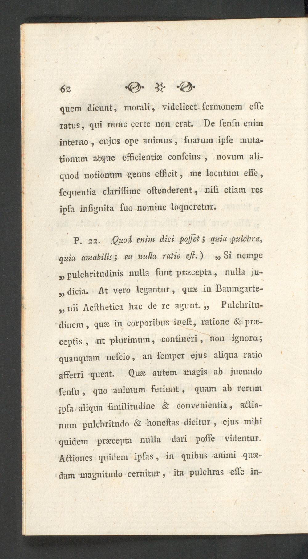 P. 22. Quod enim dici fojfet ; quia pulchra,quia amabilis i ea nulla ratio eji.) ,, Si nempe„ pulchritudinis nulla funt prsecepta, nulla ju-„ dicia. At vero legantur, quae in Baumgarte-„ „ii Aefthetica hac de re agunt. „ Pulchritu-dinem , quae in corporibus ineft, ratione &• prae-ceptis , ut plurimum, contineri, non ignoro ;quanquam nefeio, an femper ejus aliqua ratioafferri queat. Quae autem magis ab jucundotentu, quo animum feriunt, quam ab rerumipfa aliqua fimilitudine & convenientia, affio-mim pulchritudo & honeftas dicitur, ejus mihiquidem praecepta nulla dari poffe videntur.A&iones quidem ipfas, in quibus animi quae-dam magnitudo cernitur, ita pulchras effe in-