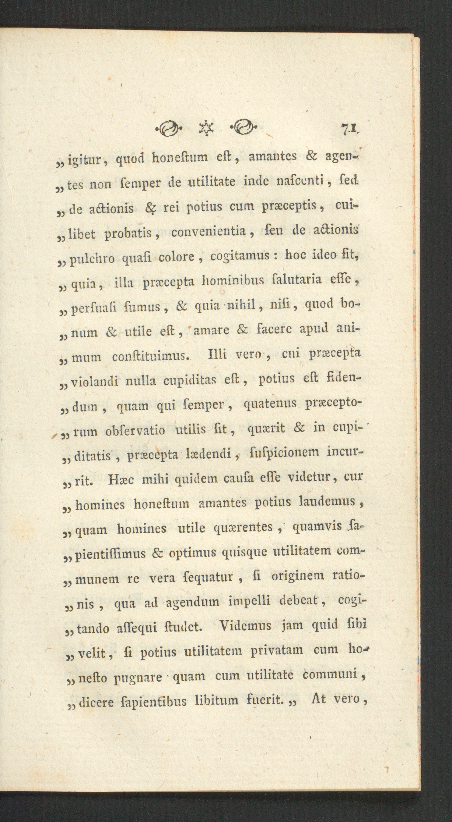 „ igitur, quod honeftum eft, amantes & agen-."„ tes non femper de utilitate inde nafccnti, fed„ de adionis & rei potius cum praeceptis, cui-j, libet probatis , convenientia, feu de adionis„ pulchro quali colore , cogitamus : hoc ideo fit,