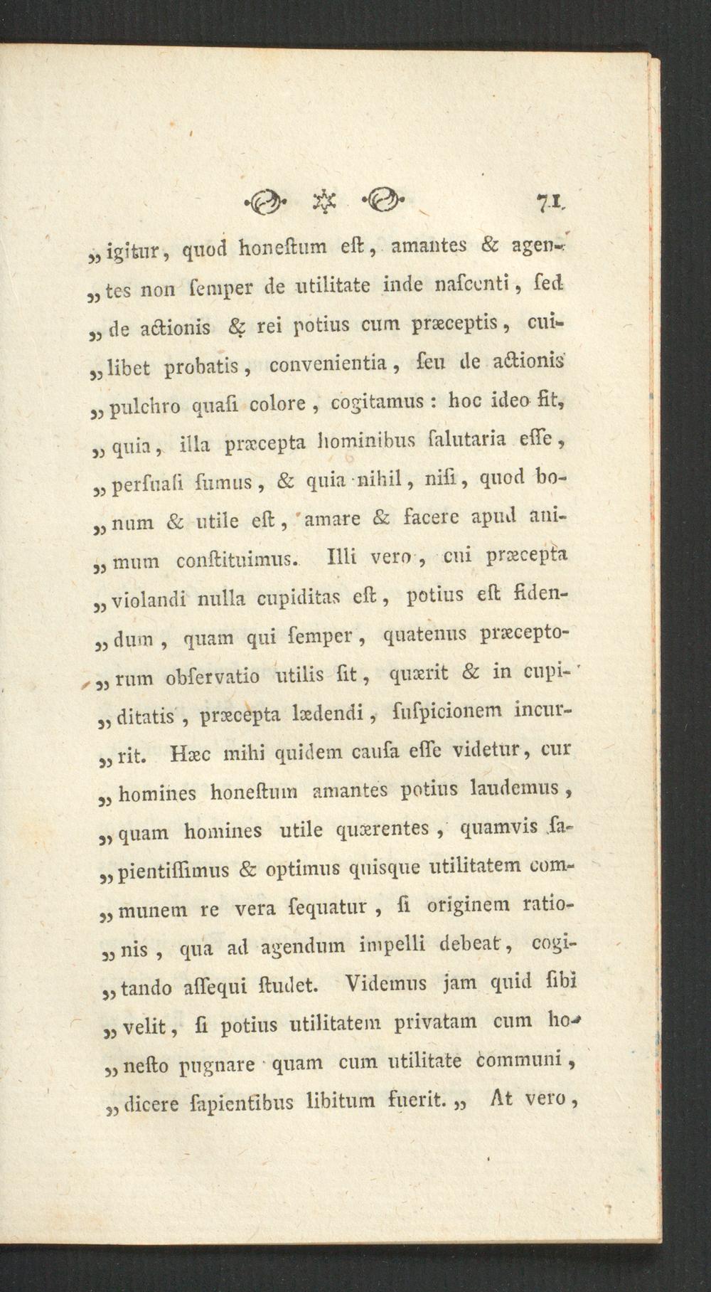 5 , perfuali fumus, & quia nihil, nifi, quod bo-„num & utile eft,'amare & facere apud ani-„ mum conftituimus. Illi vero , cui praecepta„ violandi nulla cupiditas eft, potius eft fiden-„ dum , quam qui femper, quatenus praecepto-^ 3, rum observatio utilis fit, quaerit & in cupi- '„ ditatis , praecepta laedendi, suspicionem incur-3, rit. Haec mihi quidem causa efle videtur, cur3, homines honeftum amantes potius laudemus,3, quam homines utile quaerentes, quamvis fa-,, pientiflimus & optimus quisque utilitatem com-3, munem re vera fequatur , fi originem ratio-„ nis , qua ad agendum impelli debeat, cogi-3, tando aflequi ftudet. Videmus jam quid fibi„ velit, fi potius utilitatem privatam cum ho-*35 nefto pugnare quam cum utilitate communi,„ dicere sapientibus libitum fuerit. „ At vero ,