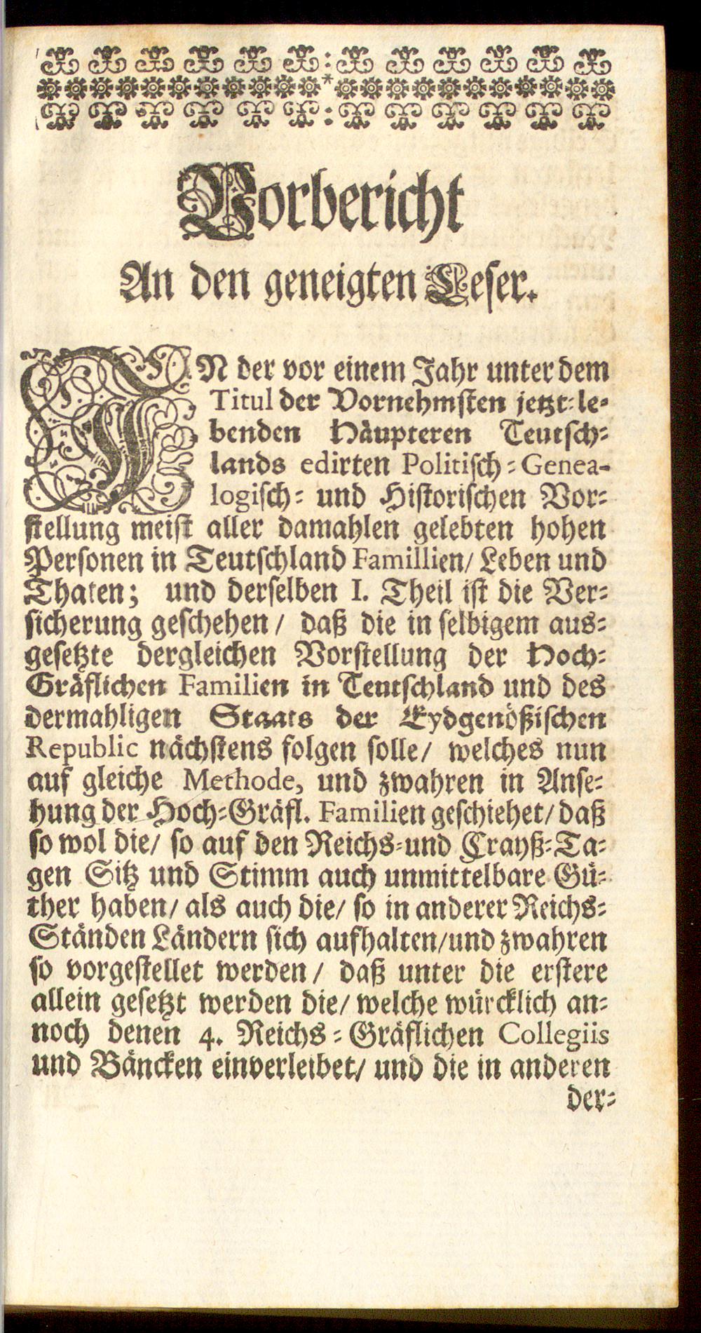 [%l der vor einem Jahr unter demTitul der 'Vornehmsten fetzt: le-benden k)äupteren Teutsch:lnnds eäirten Politisch: Genea-_ logisch: und Historischen Vor-stellung meist aller damahlen gelobten hohenPersonen in Teurschland Familüen/ Leben undThaten; und derselben I. Theil ist die Ver-sicherung geschehen / daß die in selbigem aus-gesetzte dergleichen Vorstellung der Noch:Gräflichen Familien in Teurschland und desdermahligen Staats der EidgenössischenRepubüc nächstens folgen solle/ welches nunauf gleiche Methode, und zwahren in Anse-hung der Hoch-Grafl. Familien geschiehet/daßso wol die/ so auf den Reichs-und Krayß-Ta-gen Sitz und Stimm auch unmittelbare Gü-rher haben/ als auch die/ so in anderer Rcichs-Ständen Ländern sich aufhalren/und zwahrenso vorgestellet werden / daß unter die erstereallein gesetzt werden die/ welche würcklich an-noch denen 4. Reichs - Gräflichen Collegiisund Bäncken einverletbet/ und die in anderen