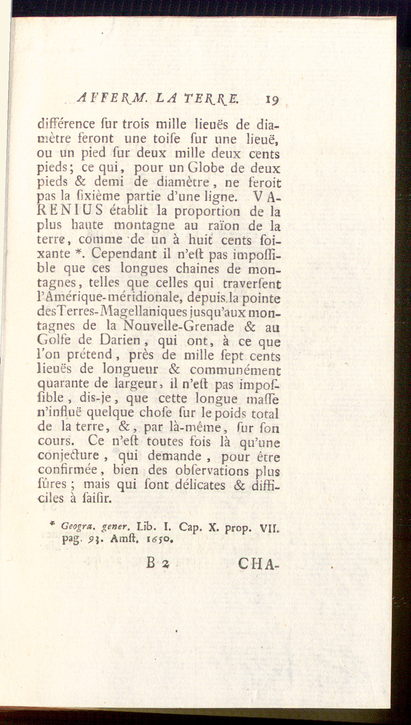 différence sur trois mille lieues de dia-mètre feront une toise sur une lieue,ou un pied sur deux mille deux centspieds; ce qui, pour un Globe de deuxpieds & demi de diamètre, ne feroitpas la sixième partie d’une ligne. V A-RENIUS établit la proportion de laplus haute montagne au raton de laterre, comme de un à huit cents soi-xante *. Cependant il n’est pas impossi-ble que ces longues chaînes de mon-tagnes, telles que celles qui traversentl’Amérique-méridionale, depuis la pointedesTerres-Magellaniques jusqu’aux mon-tagnes de la Nouvelle-Grenade & auGolfe de Darien , qui ont, à ce quel’on prétend, près de mille sept centslieues de longueur & communémentquarante de largeur, il n’ett pas impos-sible , dis-je, que cette longue massen’influë quelque chose sur le poids totalde la terre, &, par là-même, fur soncours. Ce n’est toutes fois là qu’uneconjecture , qui demande , pour êtreconfirmée, bien des observations plussûres ; mais qui font délicates & diffi-ciles à saisir.