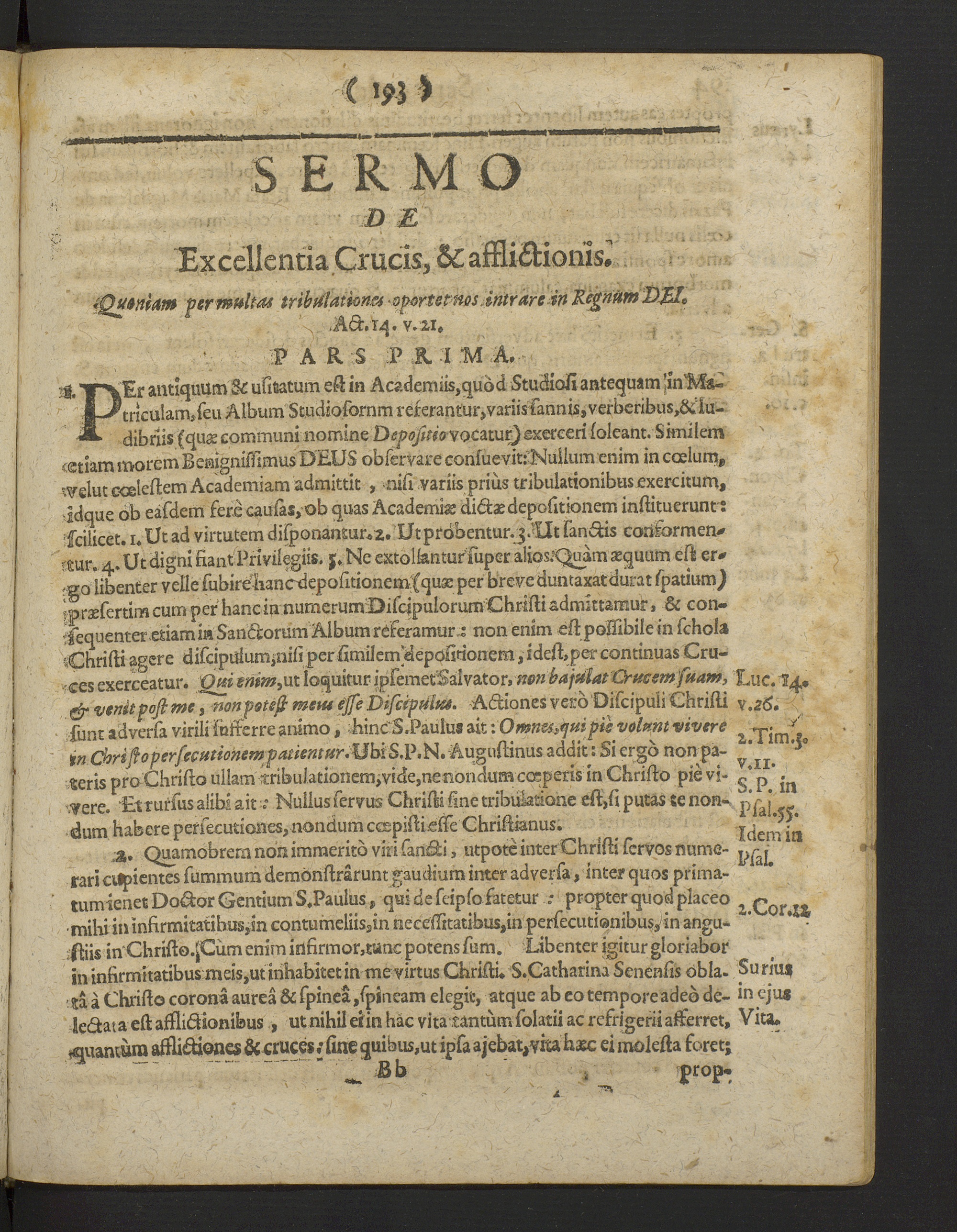i, XVEr antiquum & usitatum est in Academiis,qubd Studiosi antequam IinMa-'triculam,seu Album Studiosornm referantur,variissannis,verberibus l 8ilu-A. Ebriis (qu« communi nomine Dtpofittoy QCamxß exerceri soleant. Similemcetiam morem Benignissimus DEUS observare consueviti Nullum enim in coelum,tvelut coelestem Academiam admittit , nisi variis prius tribulationibus exercitum,idque ob easdem fere causar, ob quas Academi« dict« depositionem instituerunt :scilicet, i. Ut ad virtutem disponantur**. Ut pröbentur.j.'Ut sanctis conformemreur. 4. Ut digni fiant Privilegiis. J. Ne extollantur super aliosrQuam «quum est er*,.go libenter velle subire: hancdepositionemsqu« per breve duntaxatdurat Ipatium)<pr«sertimcum per hanc in numerumDiscipulorum Christi admittamur, & con-sequenter etiam ia Sanctorum Album referamur.: non enim est possibilem schola'.Christi agere disciptrfuminisi per similem 'depositionem ,ide{h per continuas Cru-ces exerceatur. Qui enent,ut loquitur ipsemetSal vator. non bajulat Crucem suam,& venit paß me , nonpeteß meus esse Discipulus. Actiones vero Discipuli Christisunt adversi virili fnsterre animo , -hinc'S.Paulu» ait :Omws,qui pii velum viverein Cbrifiopersecutionem patiemur. Ubi S.P.N. Augustinus addit : Si ergo non pa-teris pro Christo ullam rribulationem,vide,nenondum coeperis in Christo pie vi-vere. ‘Et rursus alibi ait ■: Nullus servus Christi fine tribulatione est,si putas te non-dum habere persecutiones, nondum caspistieste Christianus.