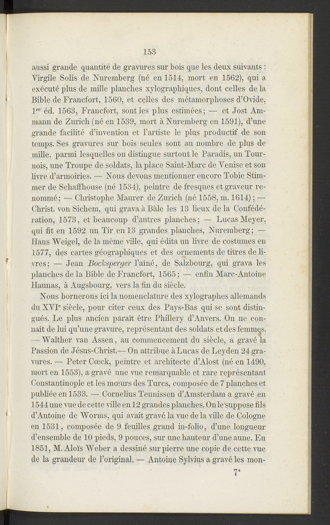 aussi grande quantité de gravures sur bois que les deux suivants :Virgile Solis de Nuremberg (né en 1514, mort en 1562), qui aexécuté plus de mille planches xylographiques, dont celles de la.Bible de Francfort, 1560, et celles des métamorphoses d’Ovide,l re éd. 1563, Francfort, senties plus estimées; — et Jost Am-nianu de Zurich (né en 1539, mort à Nuremberg en 1591), d’unegrande facilité d’invention et l’artiste le plus productif de sontemps. Ses gravures sur bois seules sont au nombre de plus demille, parmi lesquelles on distingue surtout le Paradis, un Tour-nois, une Troupe de soldats, la place Saint-Marc de Venise et sonlivre d’armoiries. — Nous devons mentionner encore Tobie Stim-mer de Schafthouse (né 1534), peintre de fresques et graveur re-nommé; — Christophe Maurer de Zurich (né 1558, m. 1614) ; —Christ, von Sichent, qui grava à Bâle les 13 lieux delà Confédé-ration, 1573, et beaucoup d’autres planches; — Lucas Meyer,qui fit en 1592 un Tir en 13 grandes planches, Nuremberg; —Mans Weigel, de la même ville, qui édita un livre de costumes en1577, des cartes géographiques et des ornements de titres de li-vres; — Jean Bocksperyer l’aîné, de Salzbourg, qui grava lesplanches de la Bible de Francfort, 1565 ; — enfin Marc-AntoineIlaunas, à Augsbourg, vers la fin du siècle.