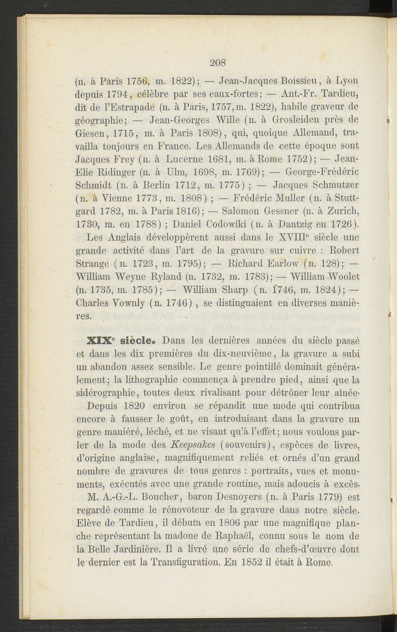 (il. à Paris 1756, m. 1822) ; — Jean-Jacques Boissieu, à Lyondepuis 1794, célèbre par ses eaux-fortes; — Ant.-Fr. Tardieu,dit de l’Estrapade (n. à Paris, 1757, m. 1822), habile graveur degéographie; — Jean-Georges Wille (n. à Grosleiden près de iGiesen, 1715, m. à Paris 1808), qui, quoique Allemand, tra-vailla toujours en France. Les Allemands de cette époque sontJacques Frey (n. à Lucerne 1681, m. à Rome 1752); — Jean-Elie Ridinger (n. à Ulm, 1698, m. 1769); — George-FrédéricSchmidt (n. à Berlin 1712, m. 1775) ; — Jacques Schmutzer(n. à Vienne 1773, m. 1808) ; — Frédéric Muller (n. à Stutt-gard 1782, m. à Paris 1816) ; — Salomon Gessner (n. à Zurich,