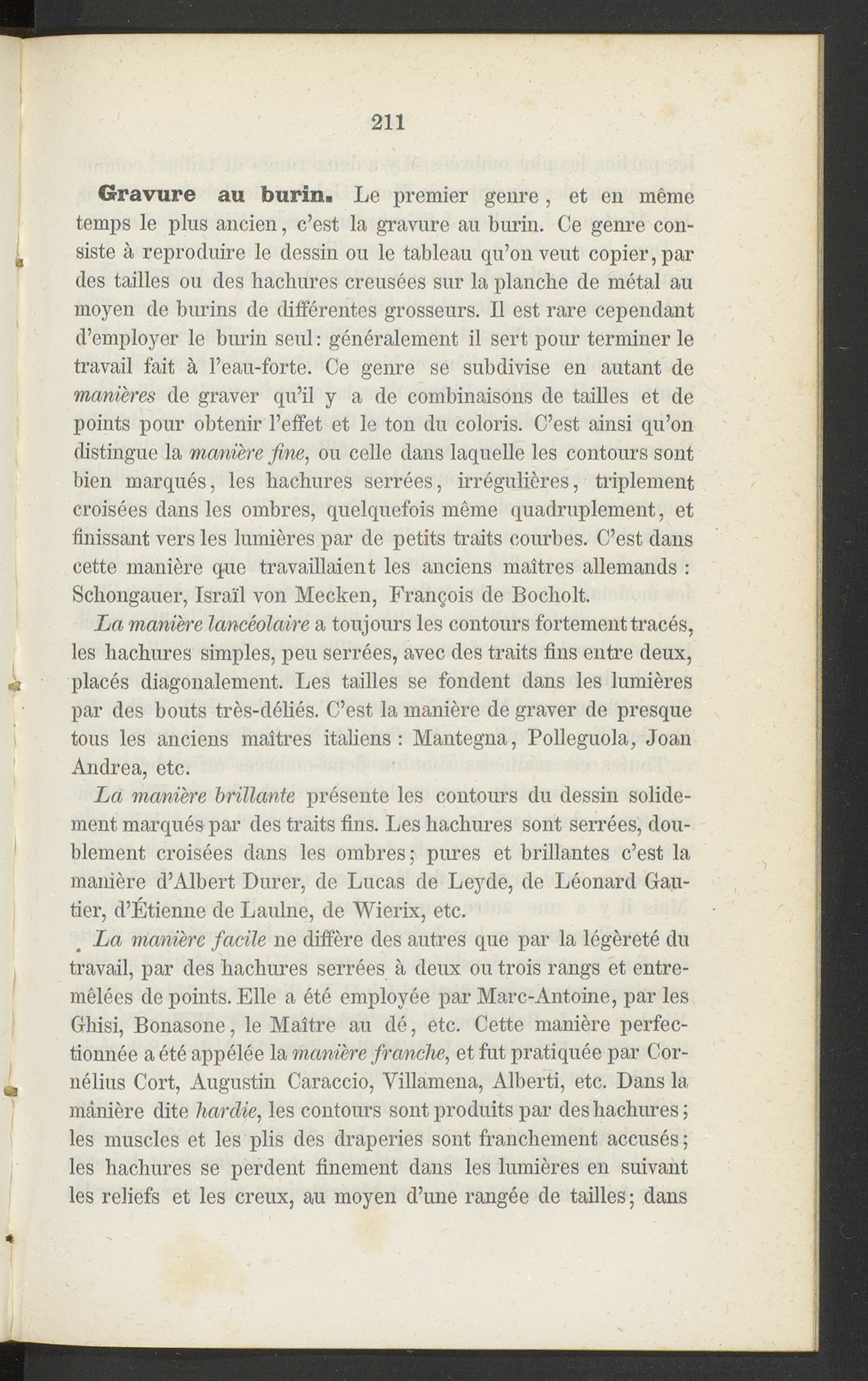 La manière brillante présente les contours du dessin solide-ment marqués par des traits fins. Les hachures sont serrées, dou-blement croisées dans les ombres; pures et brillantes c’est lamanière d’Albert Durer, de Lucas de Leyde, de Léonard Gau-tier, d’Étienne de Laulne, de Wierix, etc.