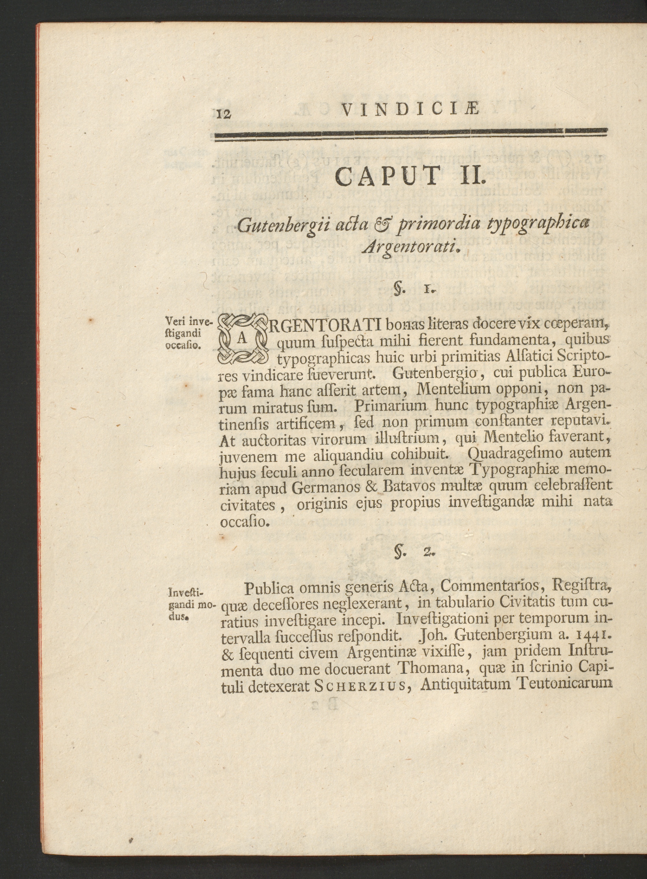 Publica omnis generis Acta, Commentarios, Registra,quae decessores neglexerant, in tabulario Civitatis tum cu-ratius investigare incepi. Investigationi per temporum in-tervalla successus respondit. Joh. Gutenbergium a. 1441.& sequenti civem Argentinas vixisie, jam pridem Instru-menta duo me docuerant Thomana, quae in scrinio Capi-tuli detexerat Scherzius, Antiquitatum Teutonicarum