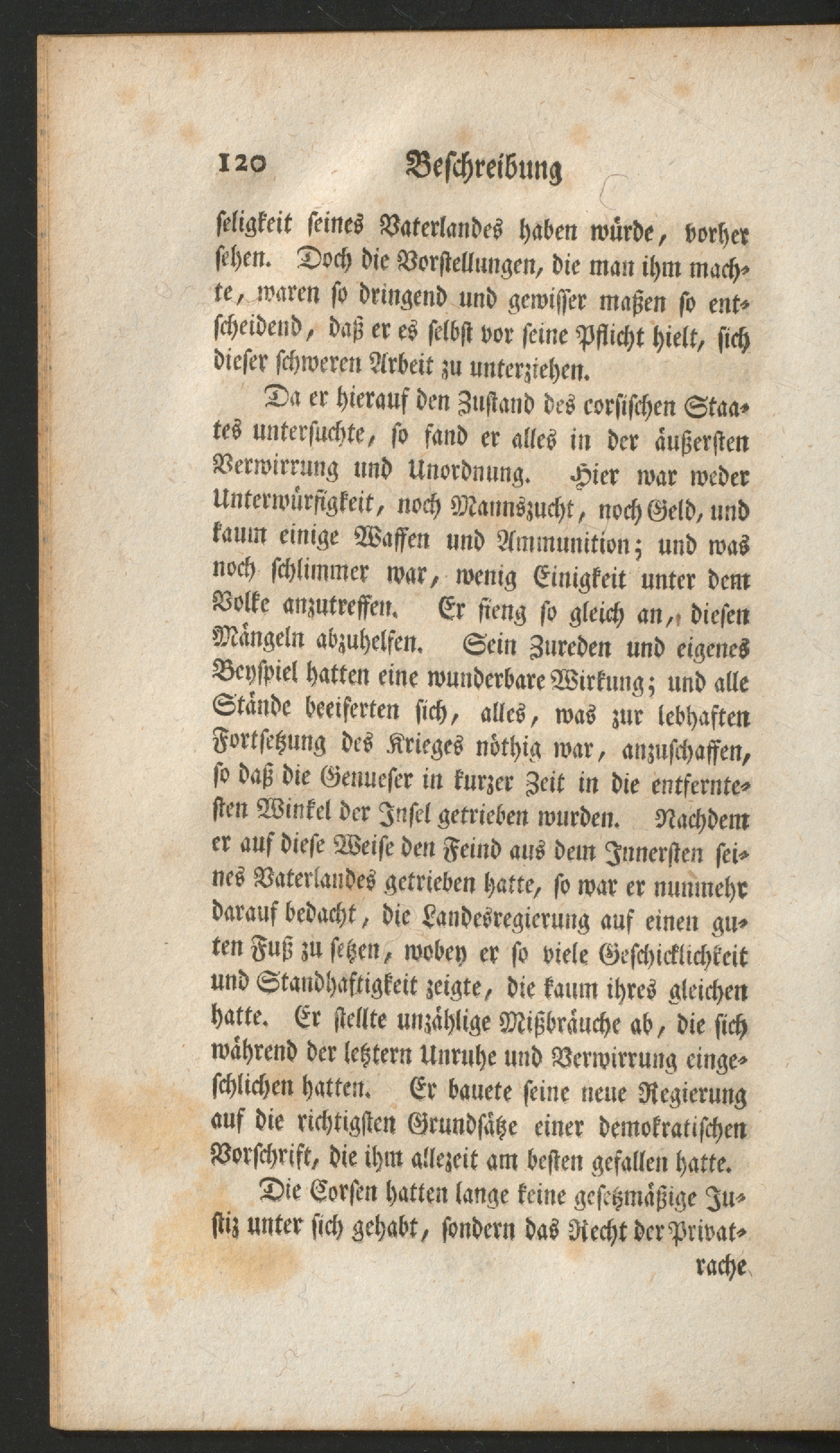 Da er hierauf den Zustand des corsischen Staa-tes untersuchte, so fand er alles in der äußerstenVerwirrung und Unordnung. Hier war wederUnterwürfigkeit, noch Mannszucht, noch Geld, undkaum einige Waffen und Ammunition; und wasnoch schlimmer war, wenig Einigkeit unter demVolke anzutreffen. Er fieng so gleich an,, diesenMangeln abzuhelfen. Sein Zureden und eigenesBeyspiel hatten eine wunderbare Wirkung; und alleStande beeiferten sich, alles, was zur lebhaftenFortsetzung des Krieges nöthig war, anzuschaffen,so daß die Genueser in kurzer Zeit in die entfernte-sten Winkel der Insel getrieben wurden. Nachdemer auf diese Weise den Feind aus dem Innersten sei-nes Vaterlandes getrieben hatte, so war er nunmehrdarauf bedacht, die Landesregierung auf einen gu-ten Fuß zu setzen, wobey er so viele Geschicklichkeitund Sündhaftigkeit zeigte, die kaum ihres gleichenhatte. Er stellte unzählige Mißbrauche ab, die sichwährend der letztem Unruhe und Verwirrung cinge-schlichen hatten. Er bauete seine neue Regierungauf die richtigsten Grundsätze einer demokratischenVorschrift, die ihm allezeit am besten gefallen hatte.