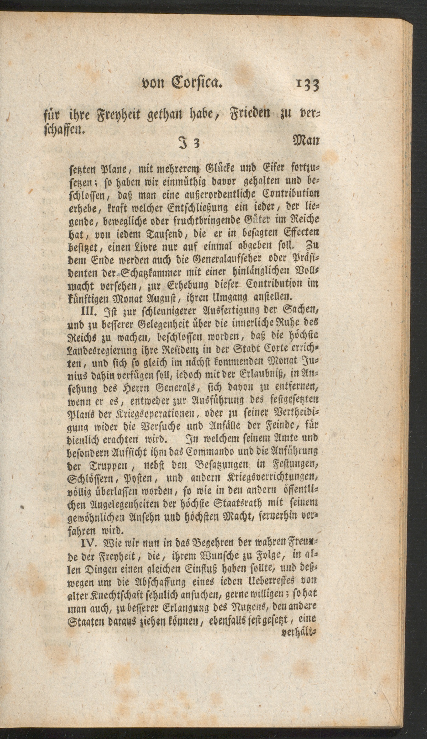 III. Ist zur schleunigerer Ausfertigung der Sachen,und zu besserer Gelegenheit über die innerliche Ruhe desReichs zu wachen, beschlossen worden, daß die höchsteLandesregierung ihre Residenz in der Stadt Corte errich-ten , und sich so gleich im nächst kommenden Monat Ju-riius dahin verfügen soll, jedoch mit der Erlaubniß, in An-sehung des Herrn Generals, sich davon zu entfernen,wenn er es, entweder zur Ausführung des festgesetztenPlans der Kriegsoperationen, oder zu seiner Vertheidi-gung wider die Versuche und Anfalle der Feinde, fürdienlich erachten wird. In welchem seinem Amte undbesondern Aussicht ihm das Commando und die Anführungder Truppen, nebst den Besatzungen, in Festungen,Schlossern, Posten, und andern Kriegsverrichtungen,völlig überlassen worden, so wie in den andern öffentli-chen Angelegenheiten der höchste Staatsrath mit seinemgewöhnlichen Ansehn und höchsten Macht, fernerhin ver-fahren wird.