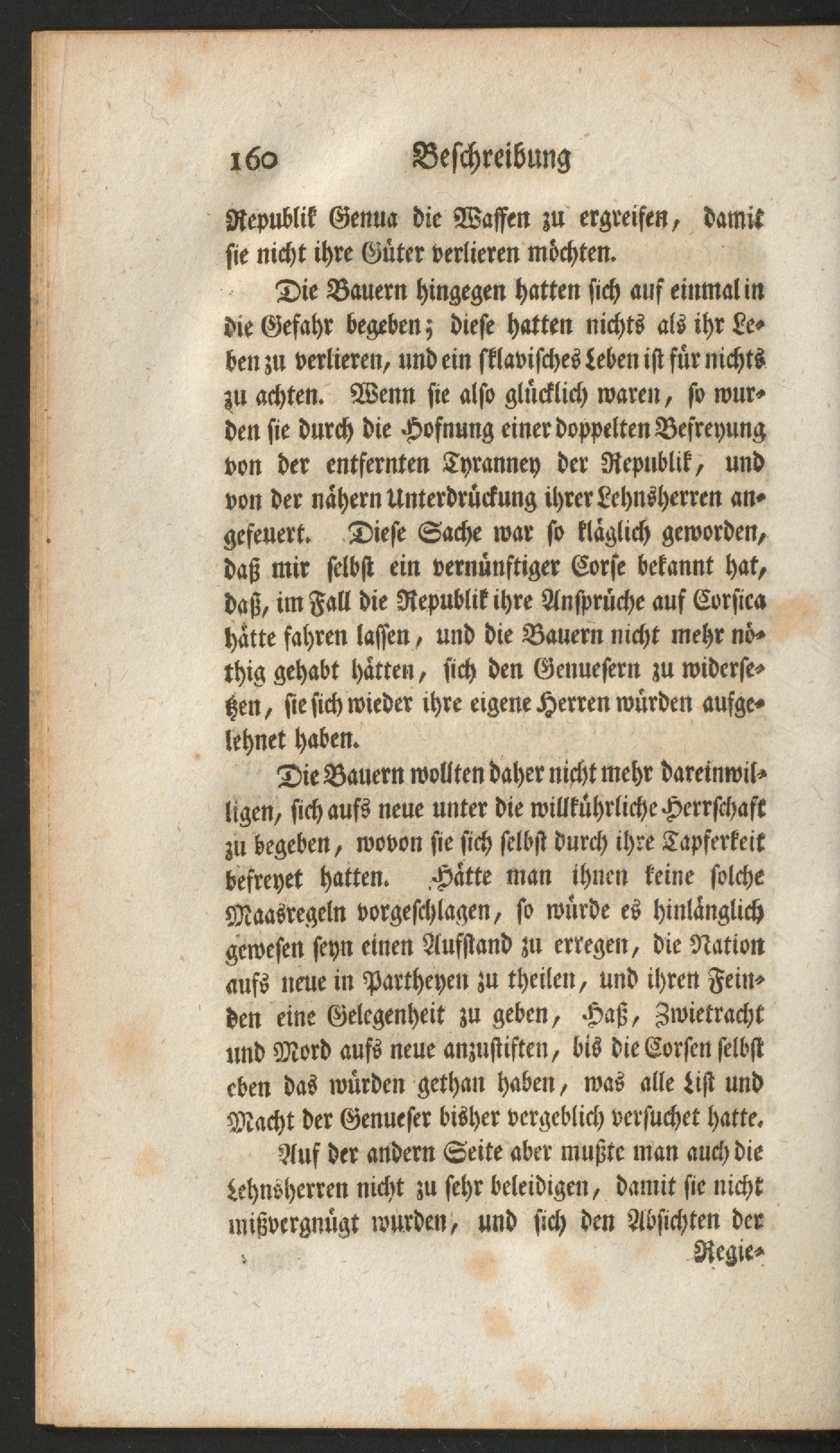 Die Bauern hingegen hatten sich auf einmal indie Gefahr begeben; diese hatten nichts als ihr Le-ben zu verlieren, und ein sklavisches Leben ist für nichtszu achten. Wenn sie also glücklich waren, so wur-den sie durch die Hofnung einer doppelten Besreyungvon der entfernten Tyranney der Republik, undvon der nähern Unterdrückung ihrer Lehnsherren an-gefeuert. Diese Sache war so kläglich geworden,daß mir selbst ein vernünftiger Corse bekannt hat,daß, im Fall die Republik ihre Ansprüche auf Cvrsicahatte fahren lassen, und die Bauern nicht mehr nö-thig gehabt hätten, sich den Genuesern zu widerse-tzen, sie sich wieder ihre eigene Herren würden aufge-lehnet haben.